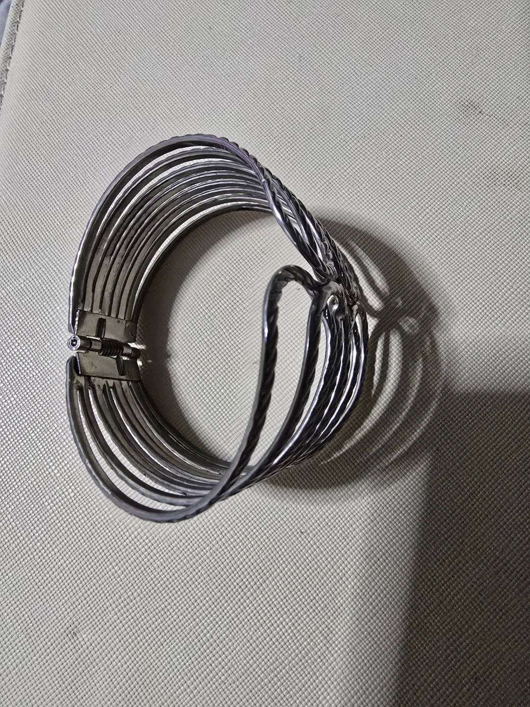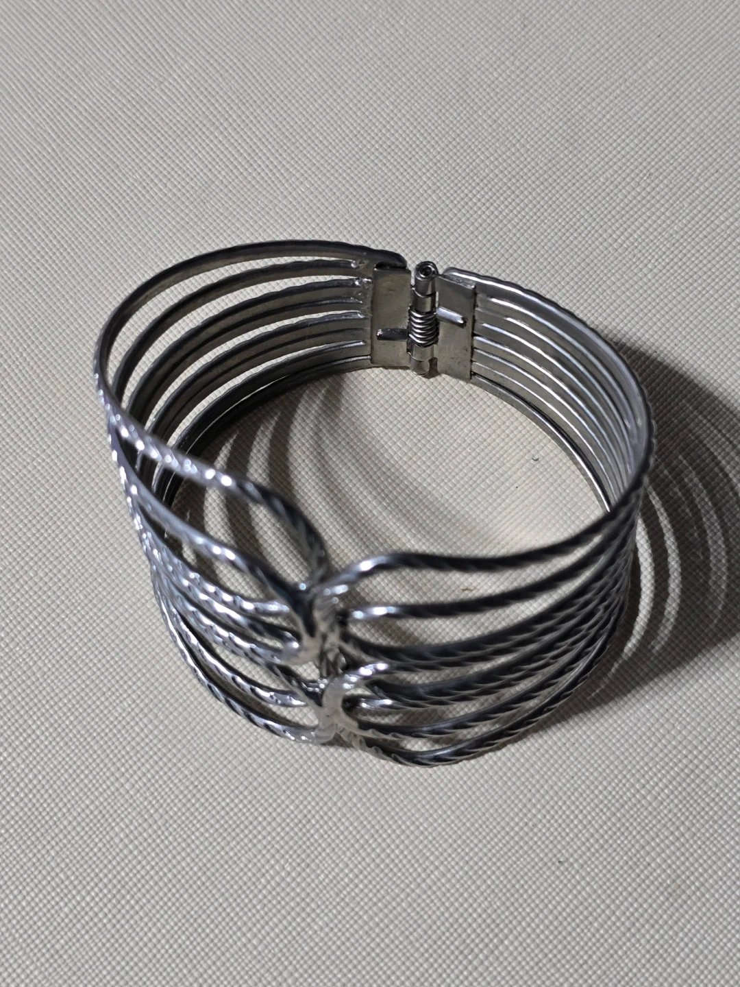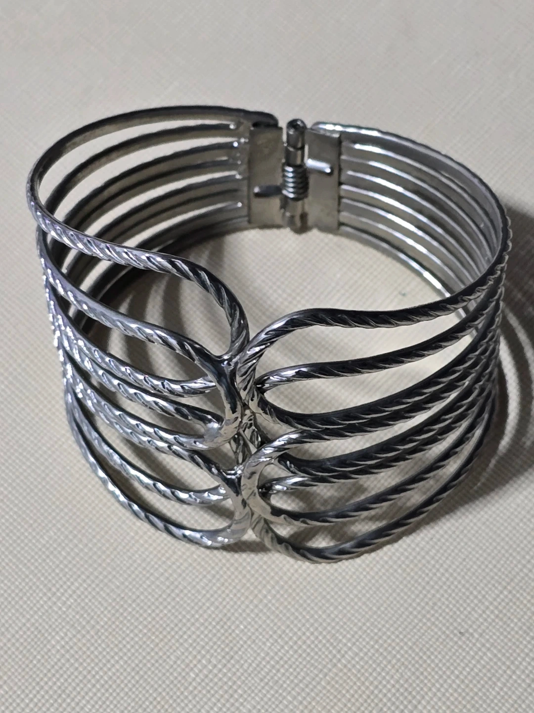 This cuff bracelet features multiple silver-tone strands with a twisted detail. It has a hinge clasp for closure. A bold accessory for any outfit!