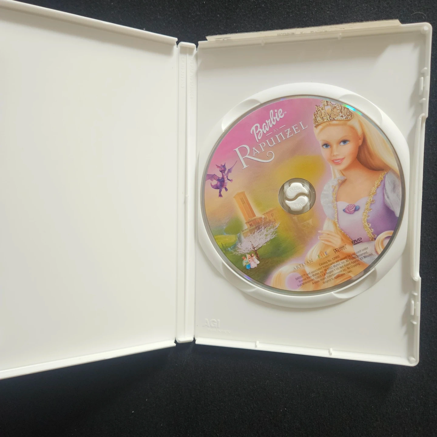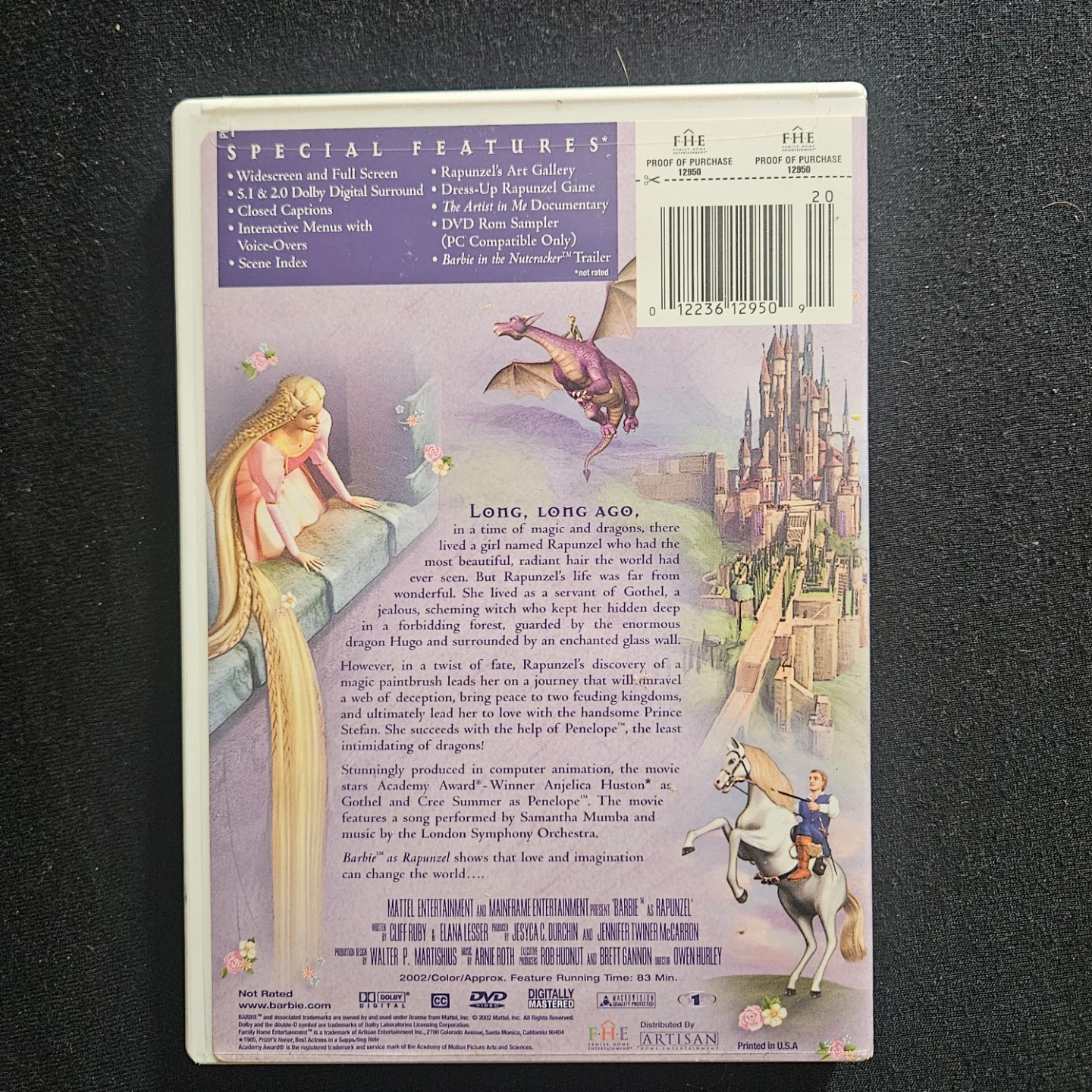 DVD works great but has some scratches. Barbie is Rapunzel in this beloved story. Kidnapped by an evil witch, Rapunzel is locked in a tower and hidden from the outside world. Rapunzel goes on a journey and with the help of her friends Penelope and Hobie, she manages to get the life she deserves and live happily ever after.