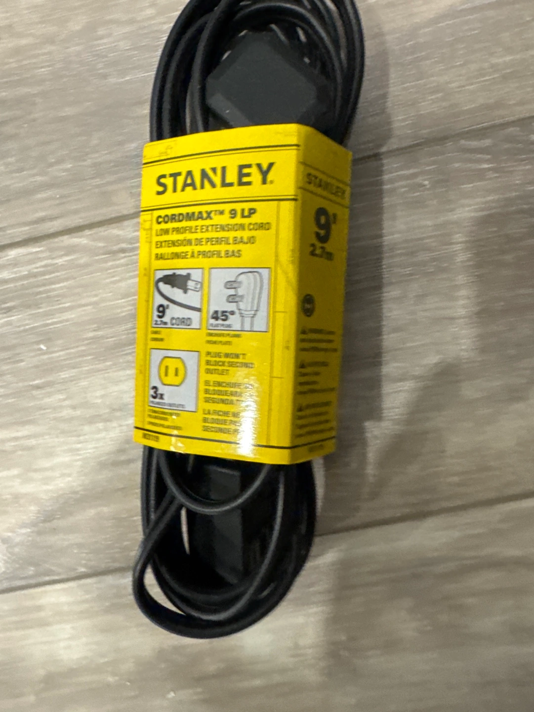 Selling a brand new Stanley Cordmax 9 LP low profile extension cord! It's 9 feet (2.7m) long and features a 45-degree plug. The packaging indicates it won't block a second outlet. Perfect for tight spaces!