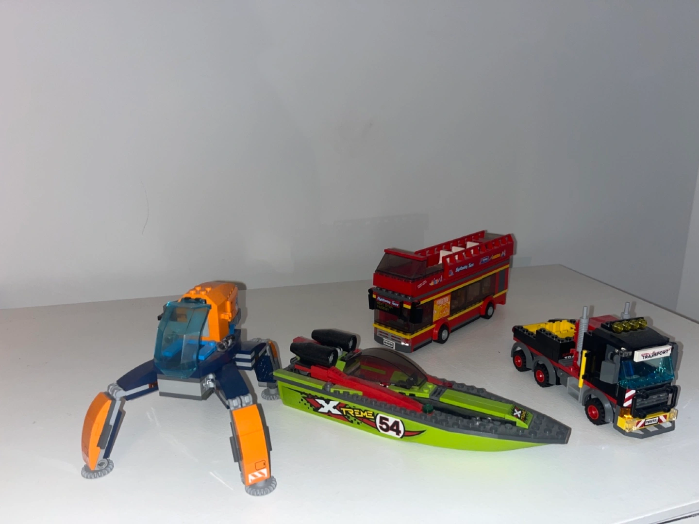 Selling a bundle of LEGO City vehicles! Includes a spider-like vehicle, a green speedboat, a red double-decker bus, and a black transport truck. Great for expanding your LEGO collection or starting a new one
