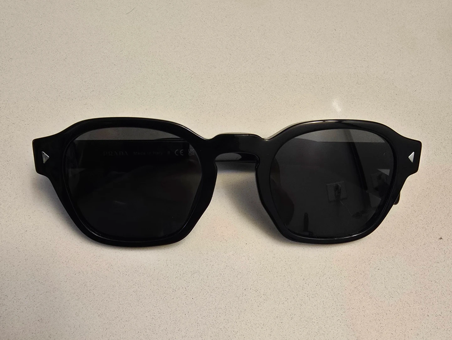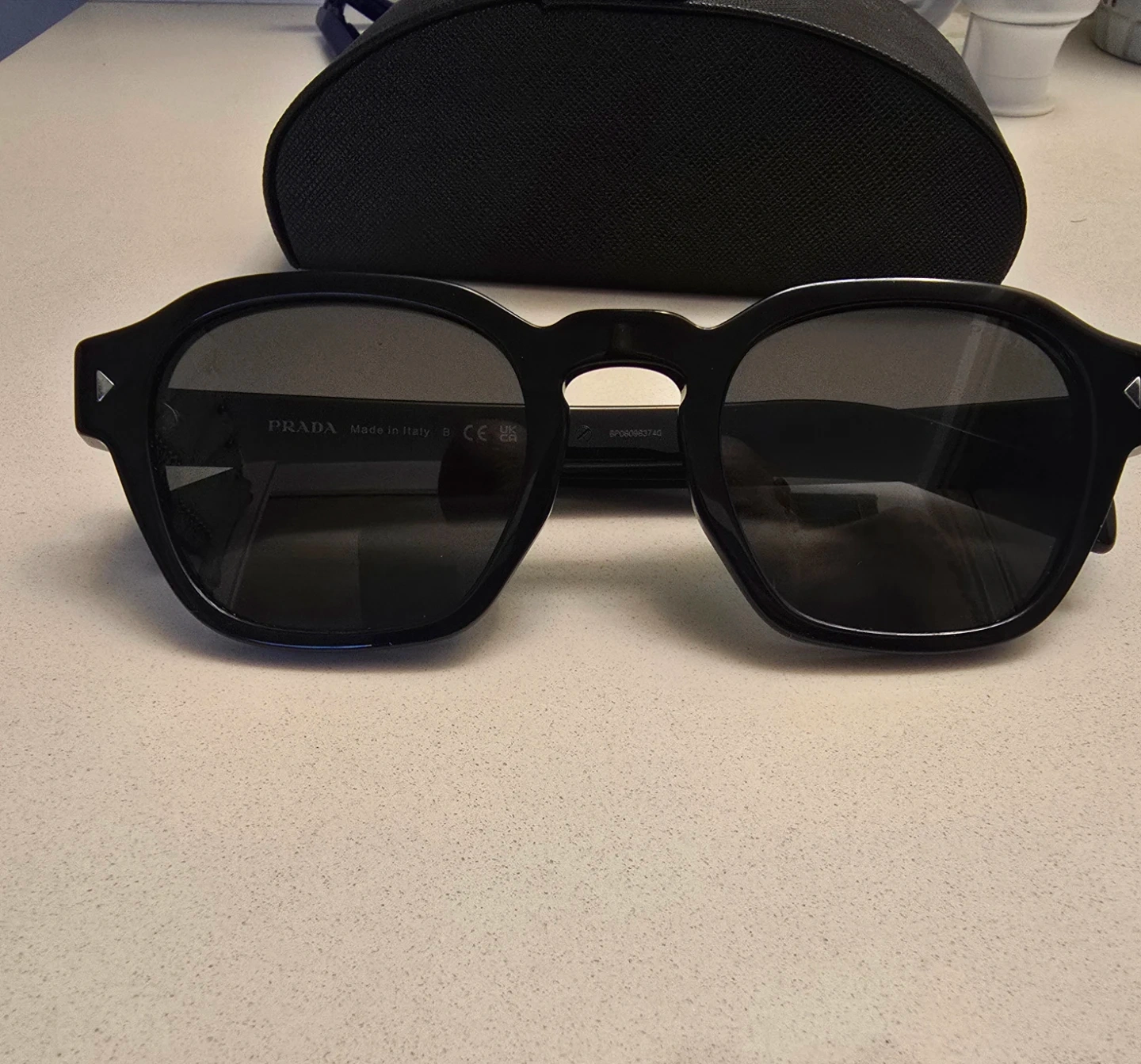 Stylish Prada sunglasses in a classic black hue. Made in Italy. Includes original Prada case for protection. These shades offer timeless appeal and quality craftsmanship.