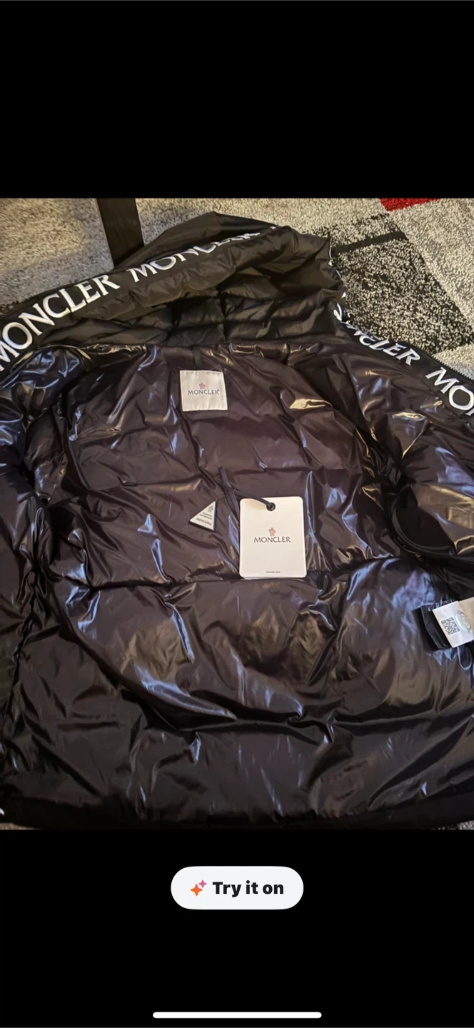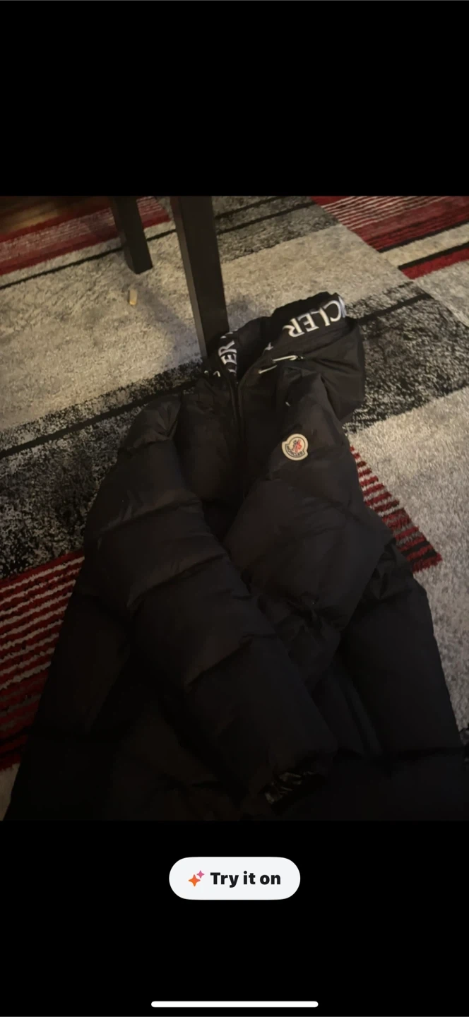 Selling a Moncler black puffer jacket. It's in great condition and comes with the original Moncler bag. The jacket features the Moncler logo on the arm and the brand name on the hood. Perfect for staying warm in style!