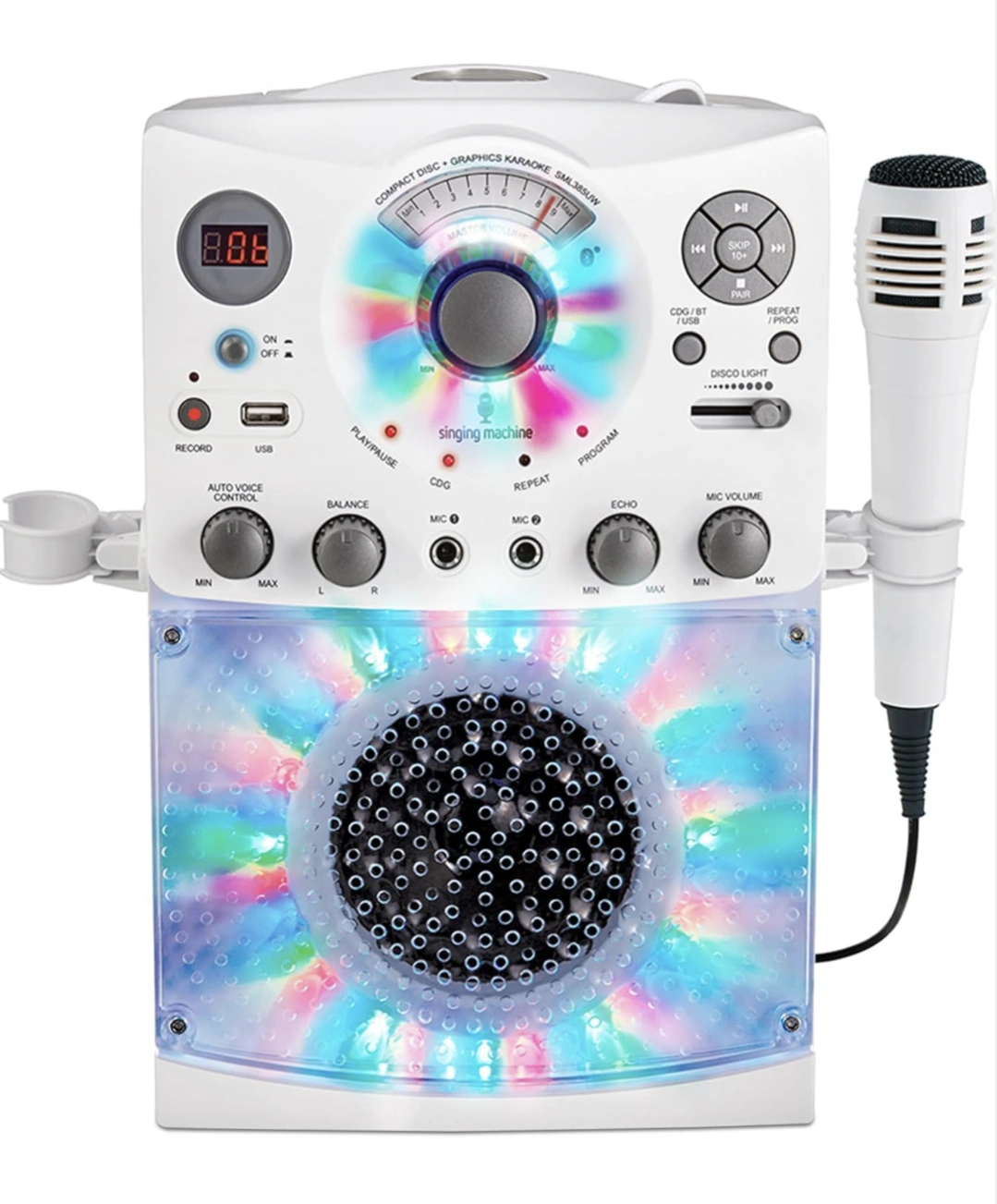 White singing machine. Controls include auto voice, balance, echo, and mic volume. Features a disco light and USB port. Having this karaoke machine on hand would be a wonderful way to relax and have fun.