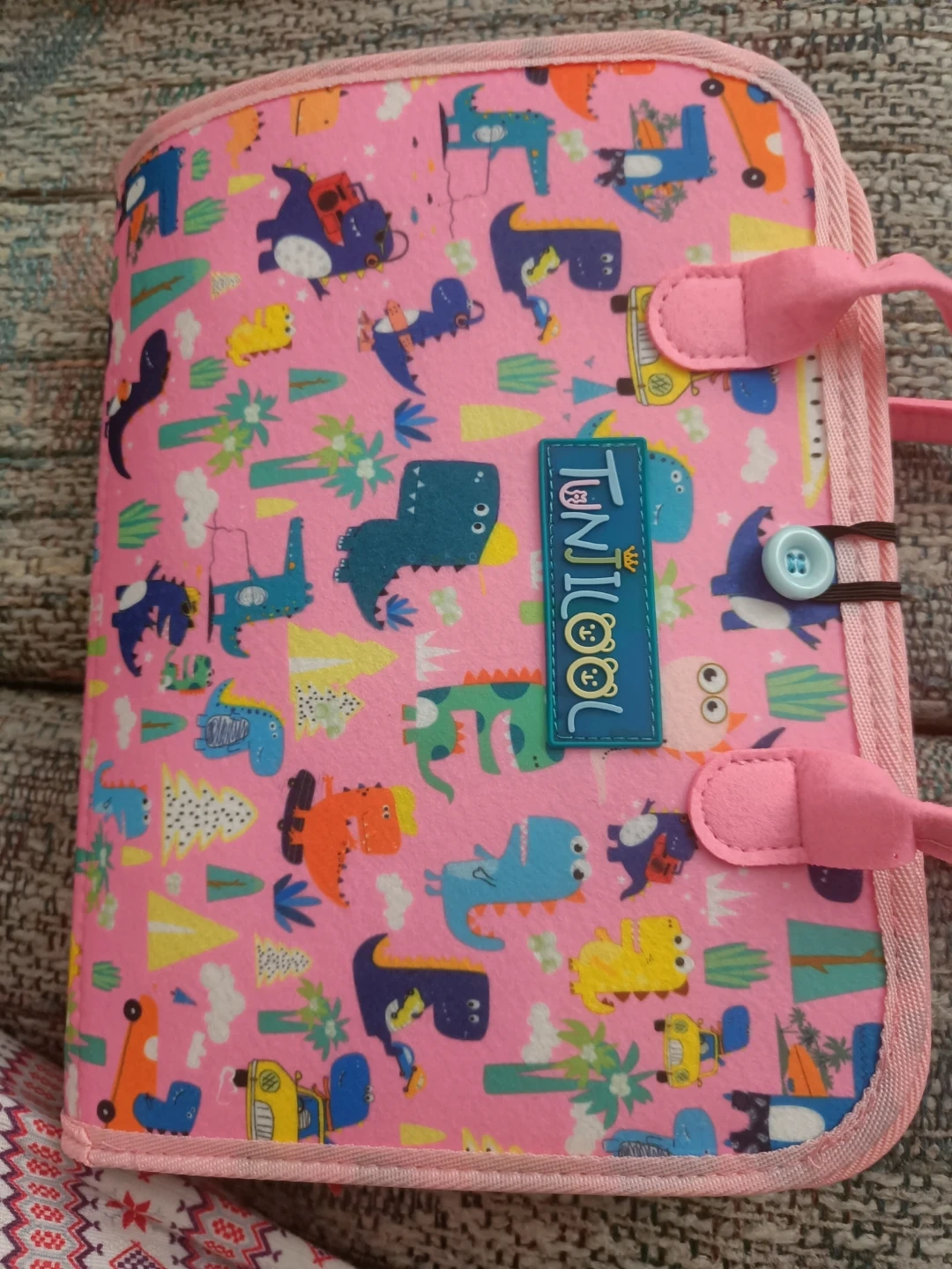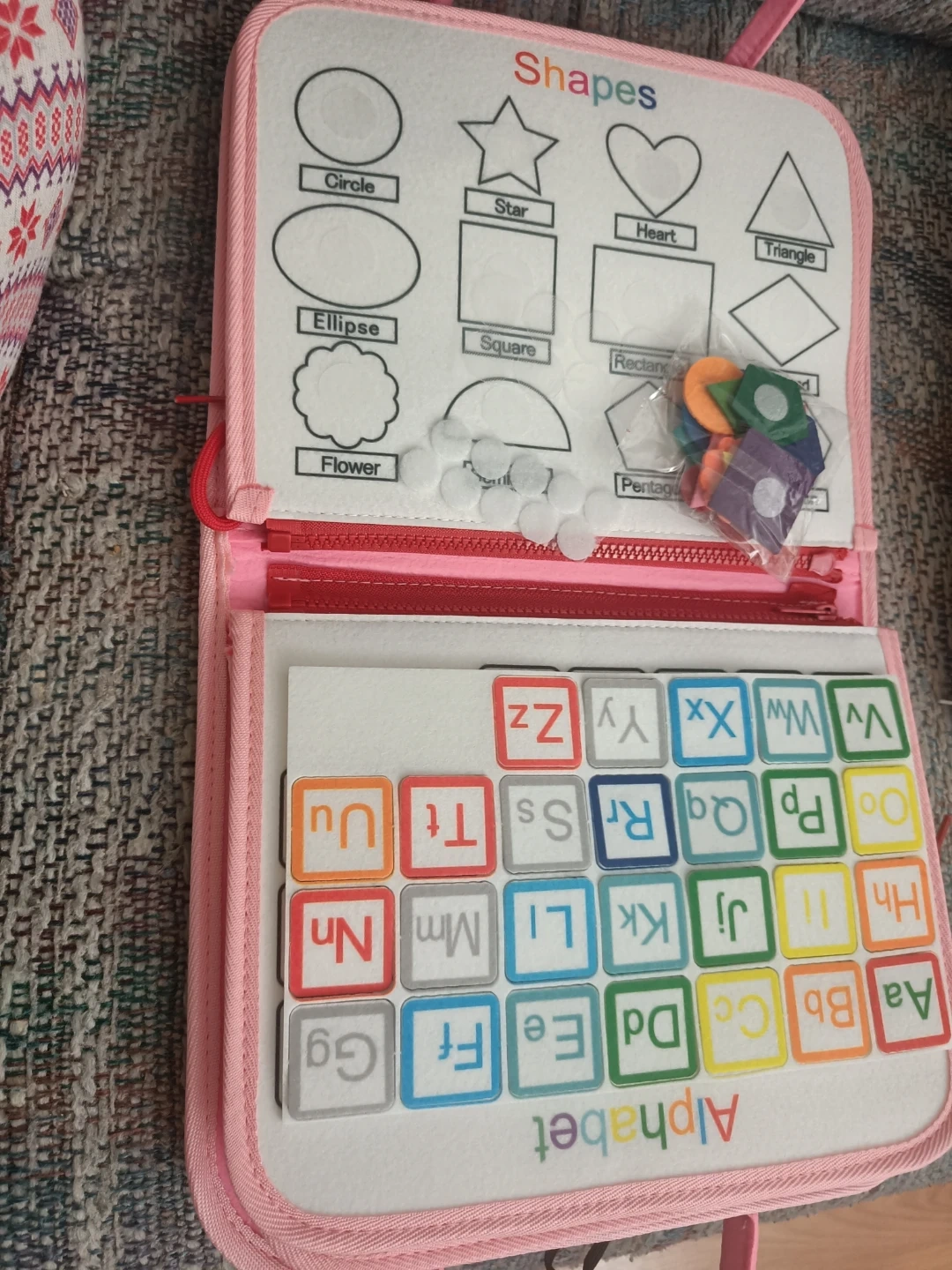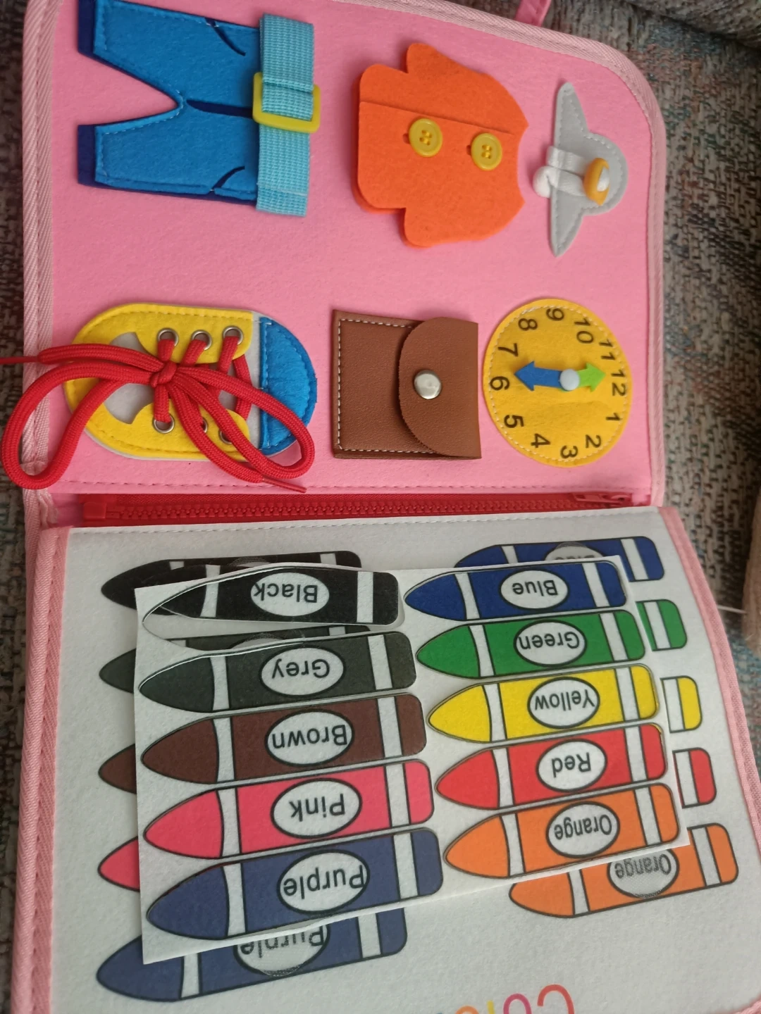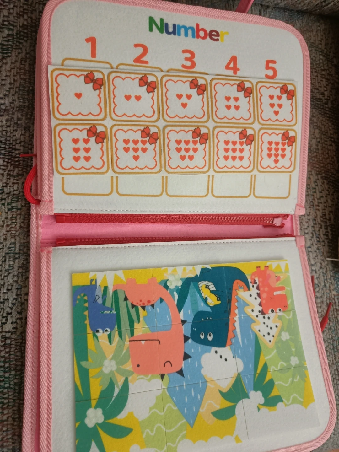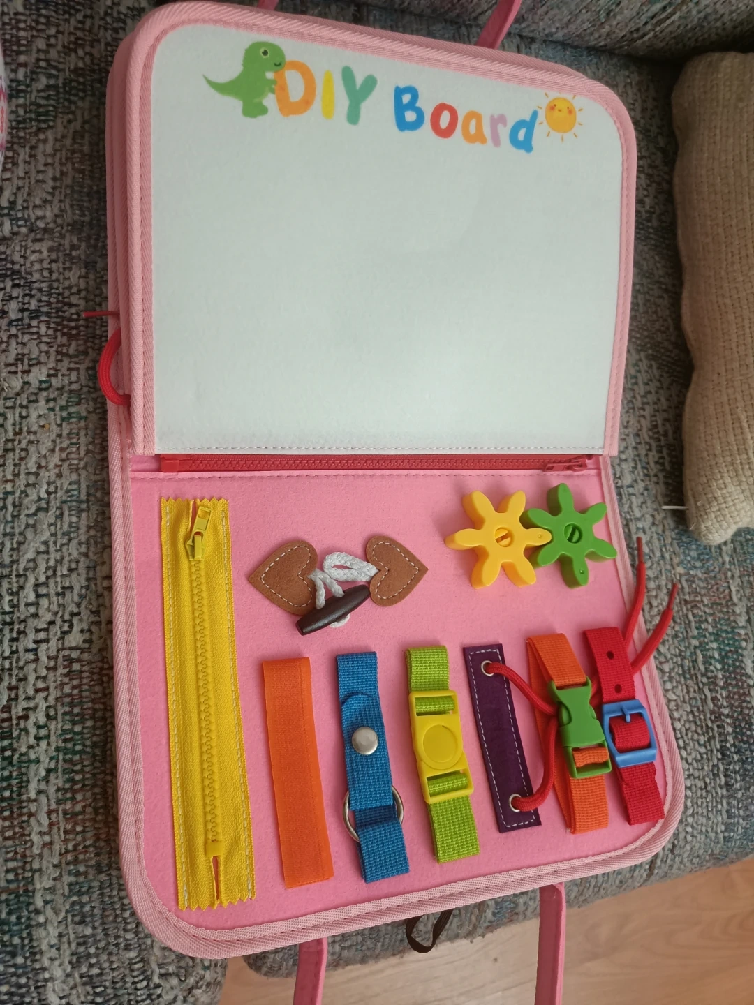 This pink felt activity board is covered in a fun dinosaur print. It includes multiple sections for learning numbers, letters, and shapes. It also has various buckles, zippers, and lacing activities for fine motor skill development. This board's great for keeping little ones busy and learning!