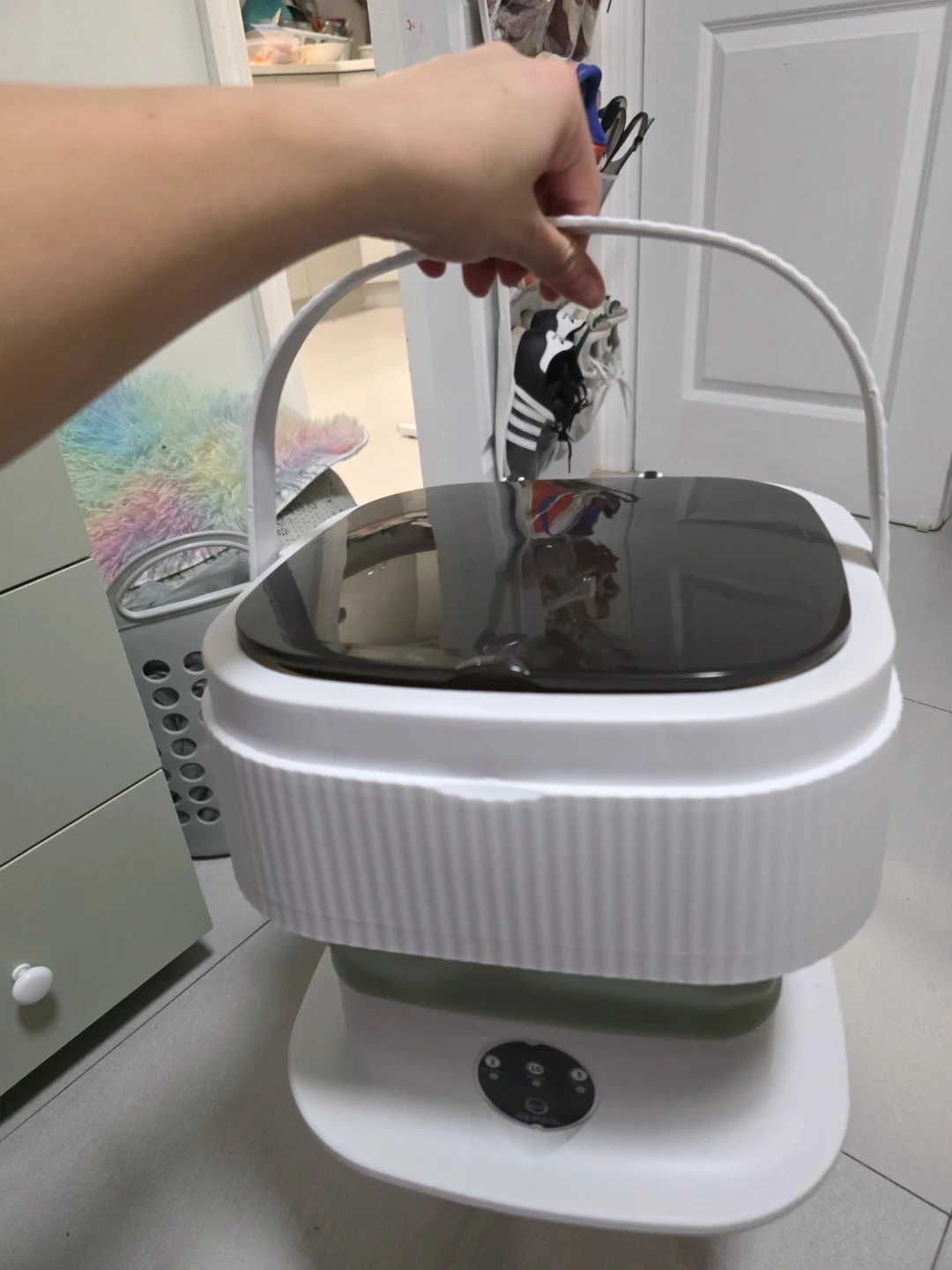 This is a portable, foldable washing machine. It is perfect for small loads or delicate items. Features include a foldable design and easy-to-use controls. The machine offers multiple wash cycles for different needs.