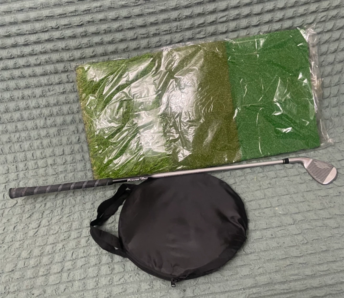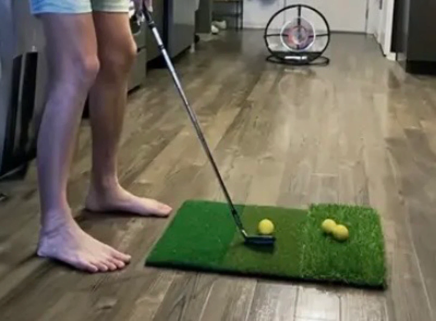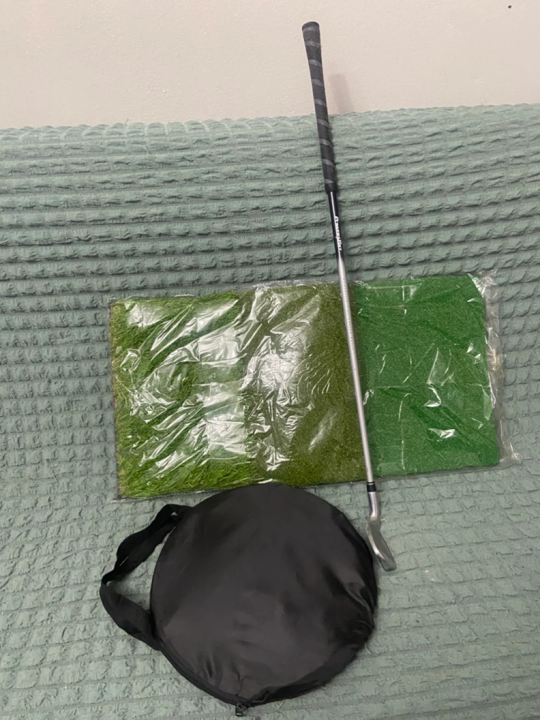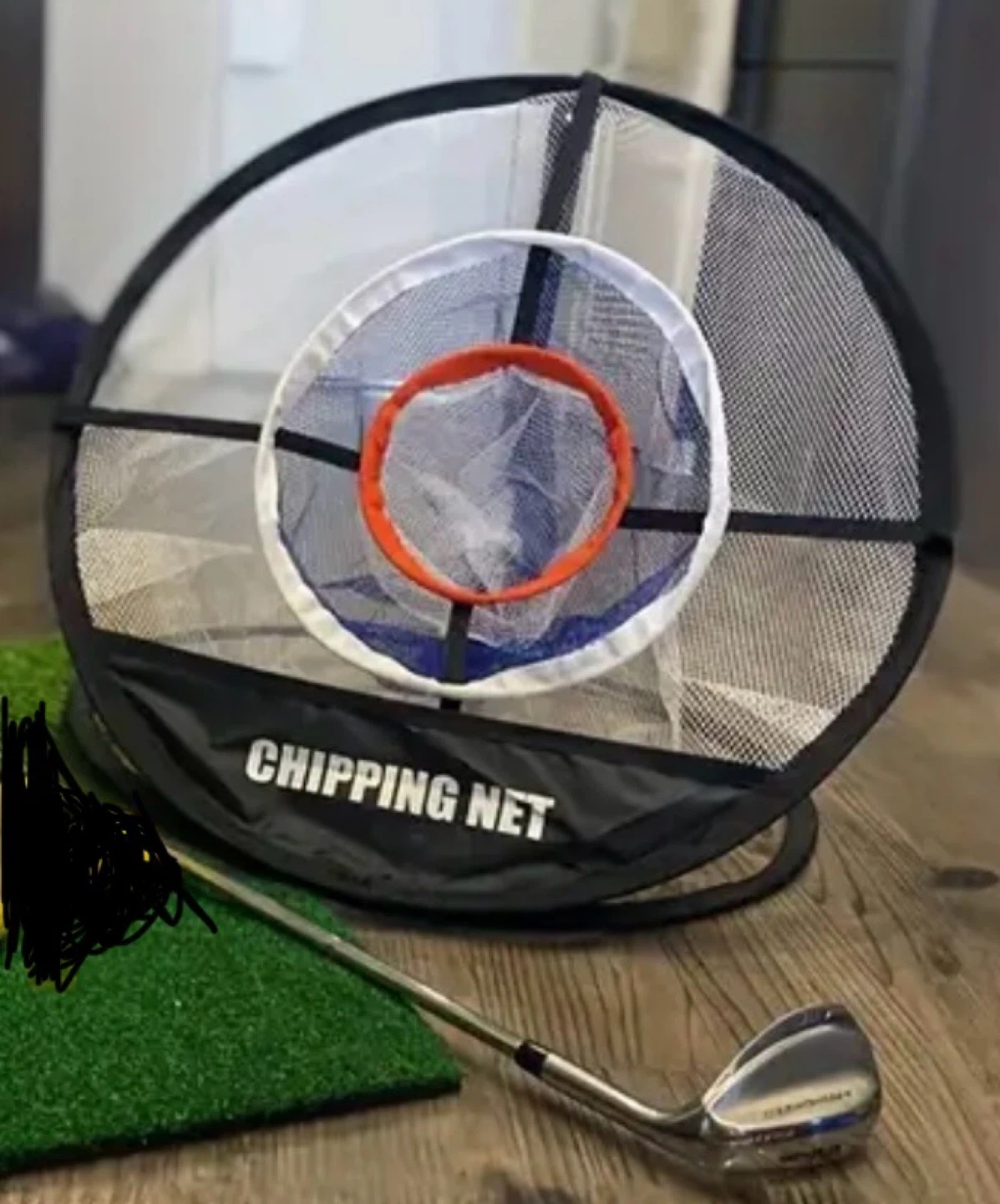 This set includes a golf chipping mat and a portable chipping net. It also comes with a golf club. Practice your swing indoors or outdoors!