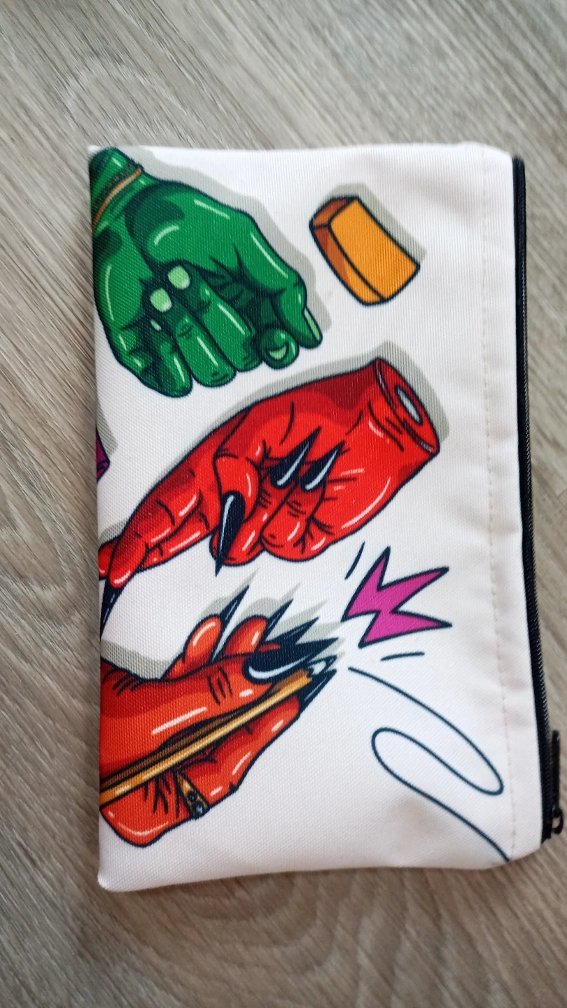 A fun pouch featuring a quirky graphic of hands drawing and erasing. It's great for storing small items like pens, pencils, or makeup. This pouch is made from a durable fabric and has a zippered closure.
