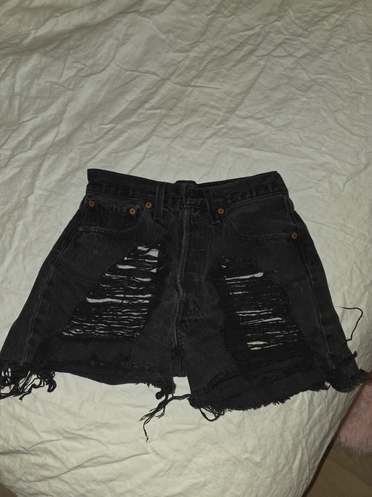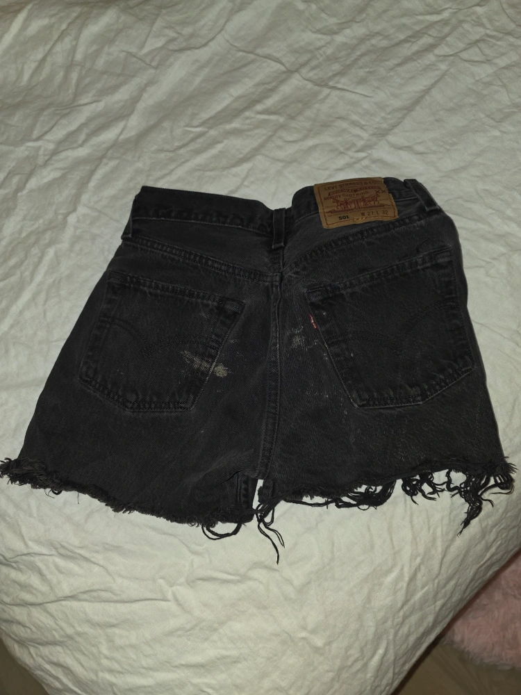 Selling a pair of Levi's 501 denim shorts in black. The size is 27. They have a distressed, cutoff style. Perfect for a casual, edgy look!