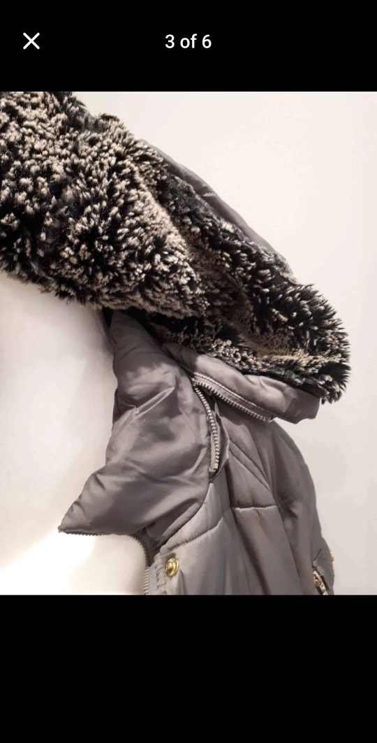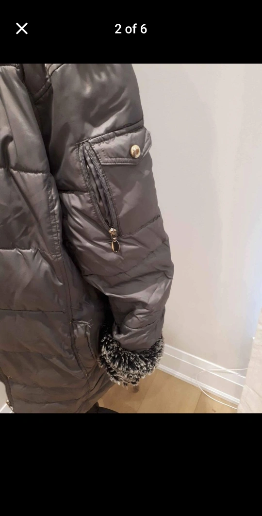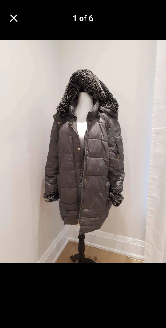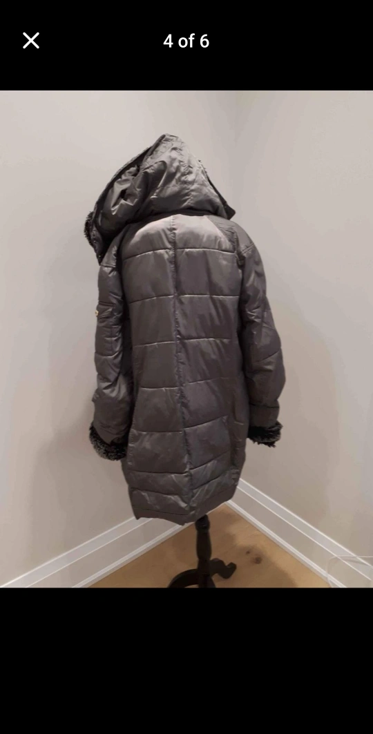 This coat is grey and features a zipper and button closure, a hood with faux fur lining, and faux fur lining on the collar and cuffs. It has pockets on the front and a pocket on the left sleeve. The coat has a quilted design.