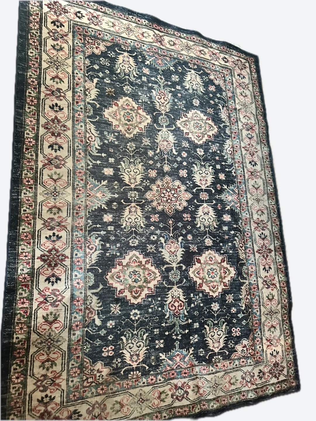 Beautiful area rug with a classic Persian-inspired design. Features intricate patterns in navy, cream, and burgundy. Adds a touch of elegance to any room. Suitable for living rooms or bedrooms.