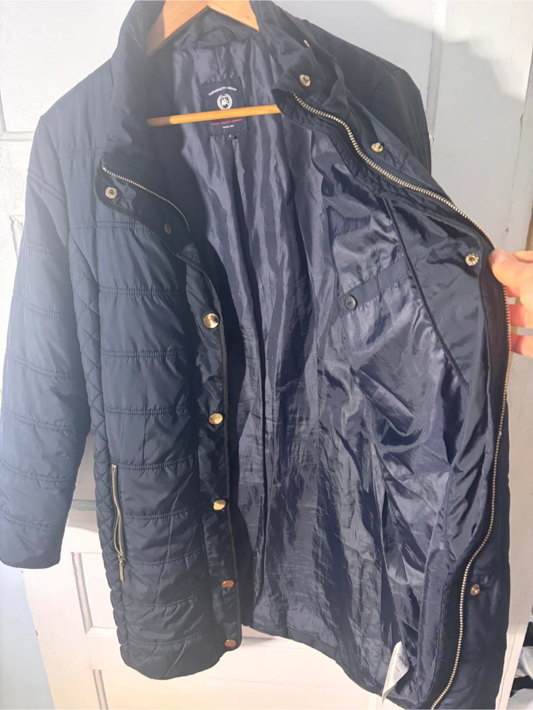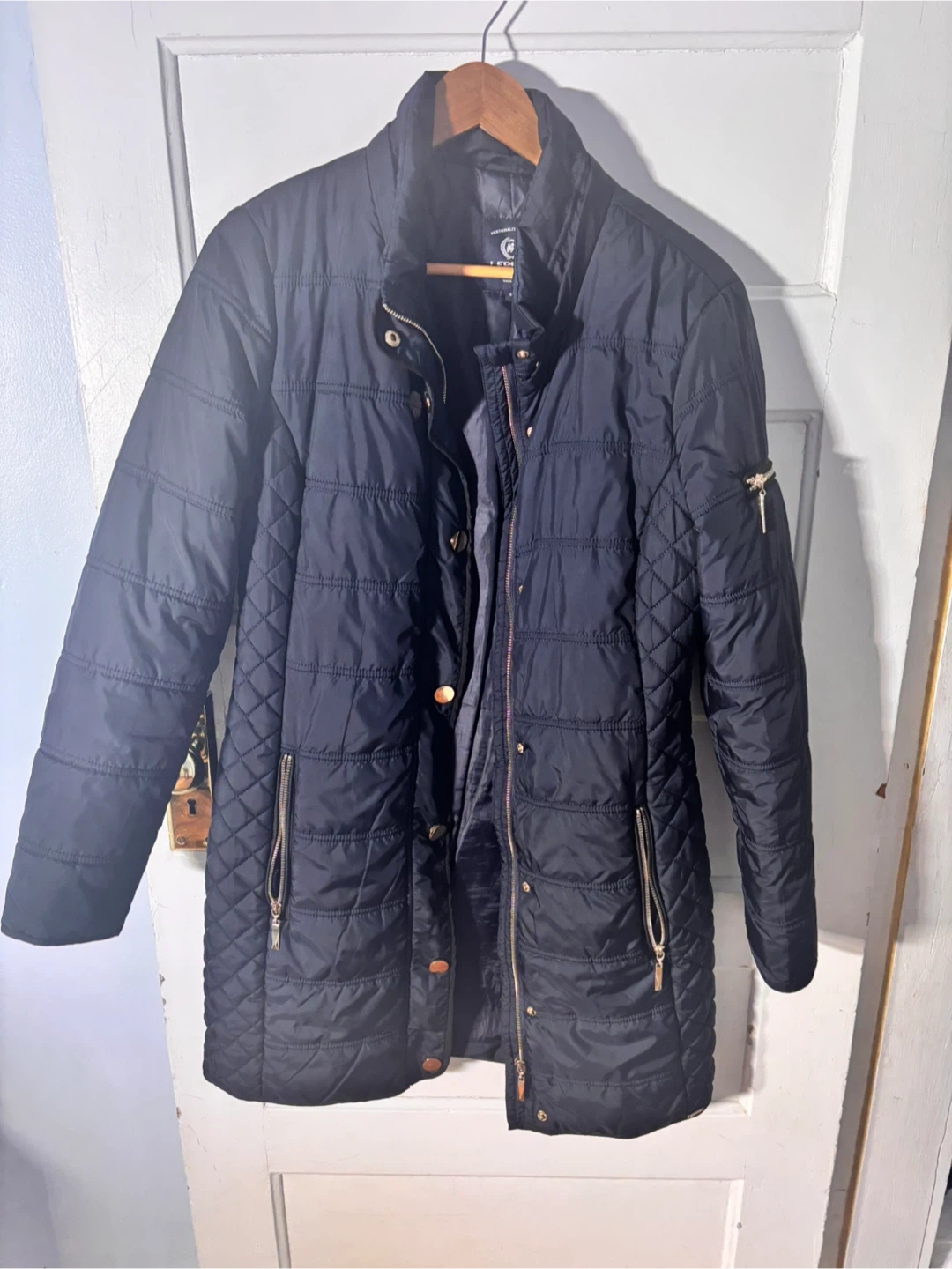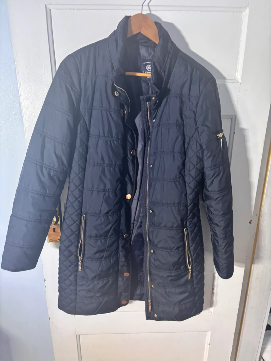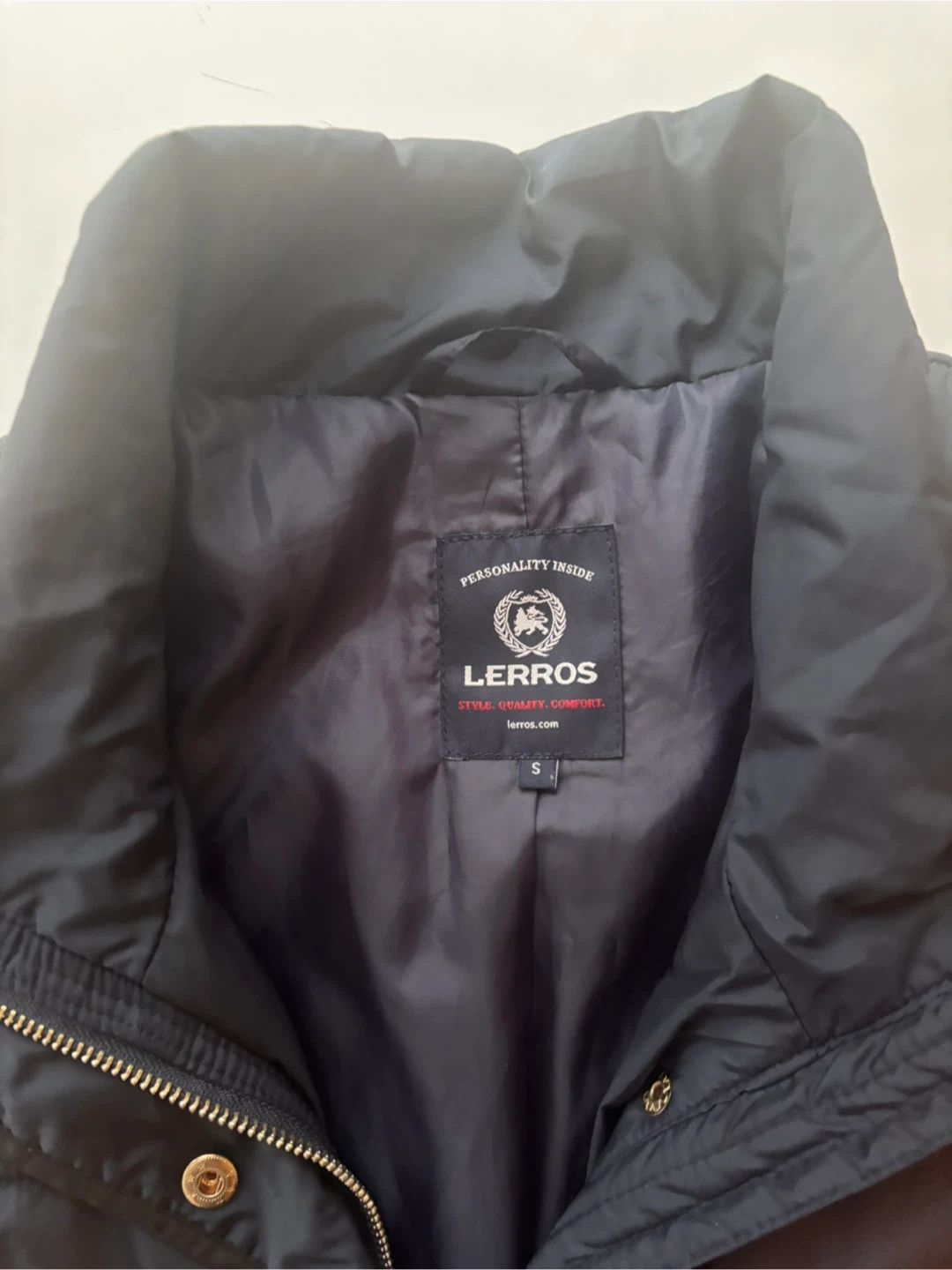 This is a Lerrros quilted jacket in navy. It's a size S/M Features zippered pockets and a stand-up collar. Great for cooler weather!