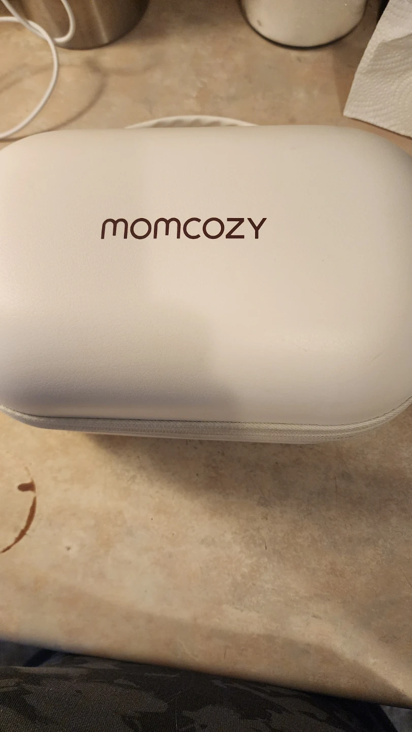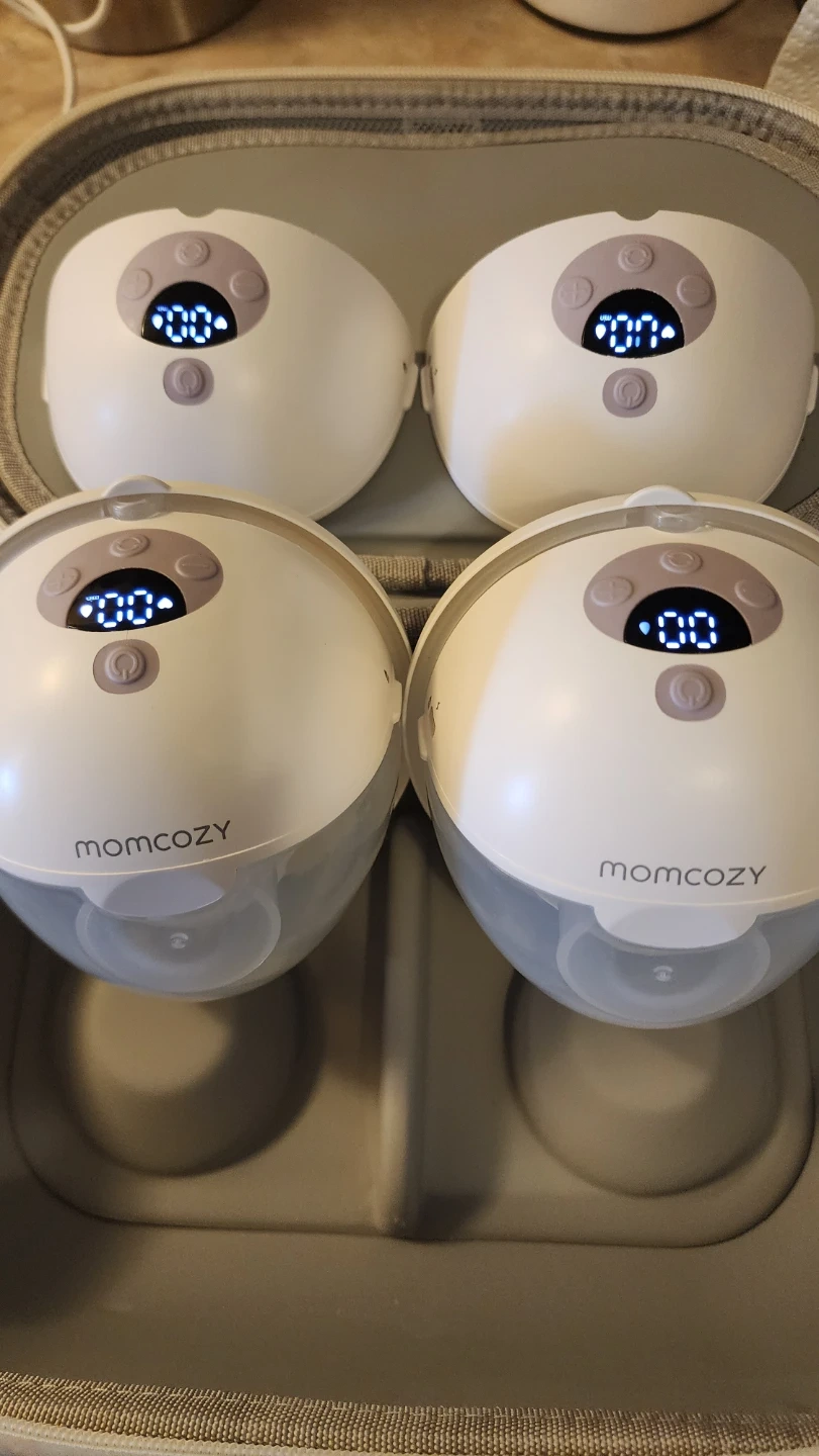 Two Momcozy wearable breast pumps are included in this set. All accessories and the charging cable are also present. The items come in their original carrying case.