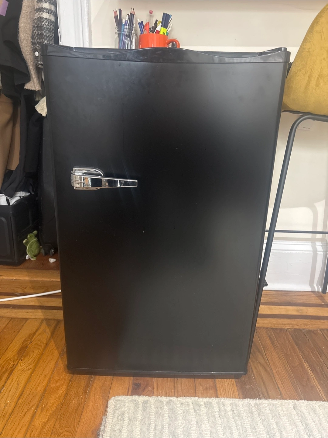 Black mini freezer (no fridge).