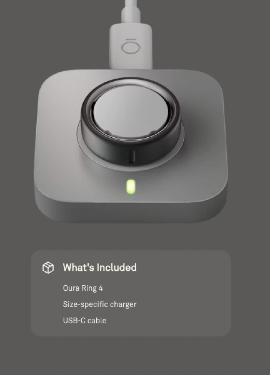 Oura Ring 4 charger and USB-C cable included. This size-specific charger is designed for the Oura Ring 4. Size6