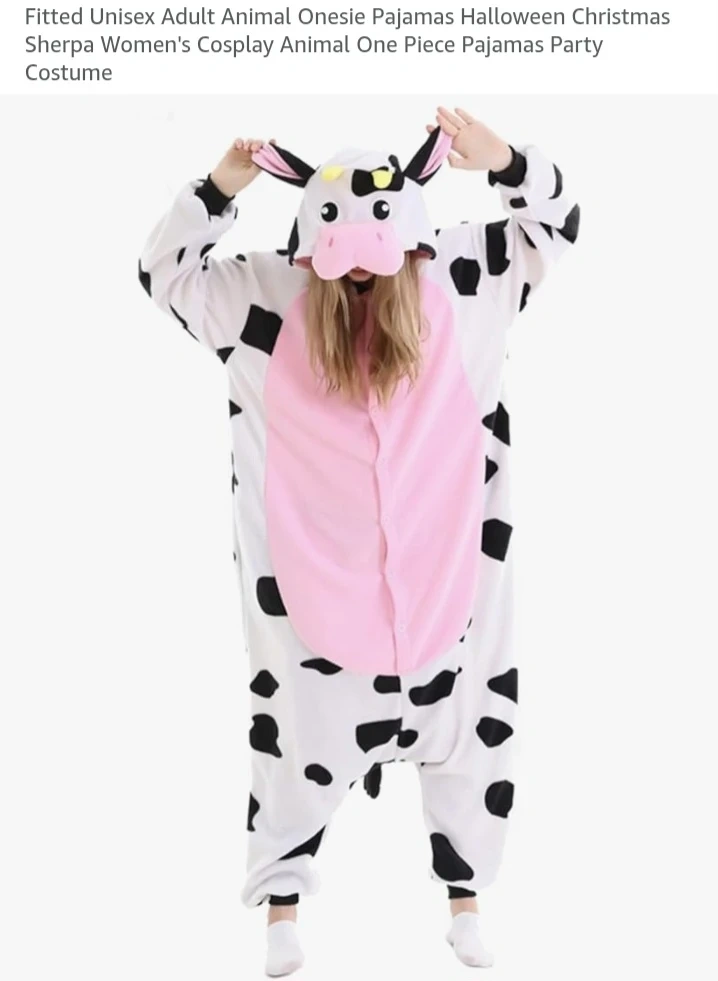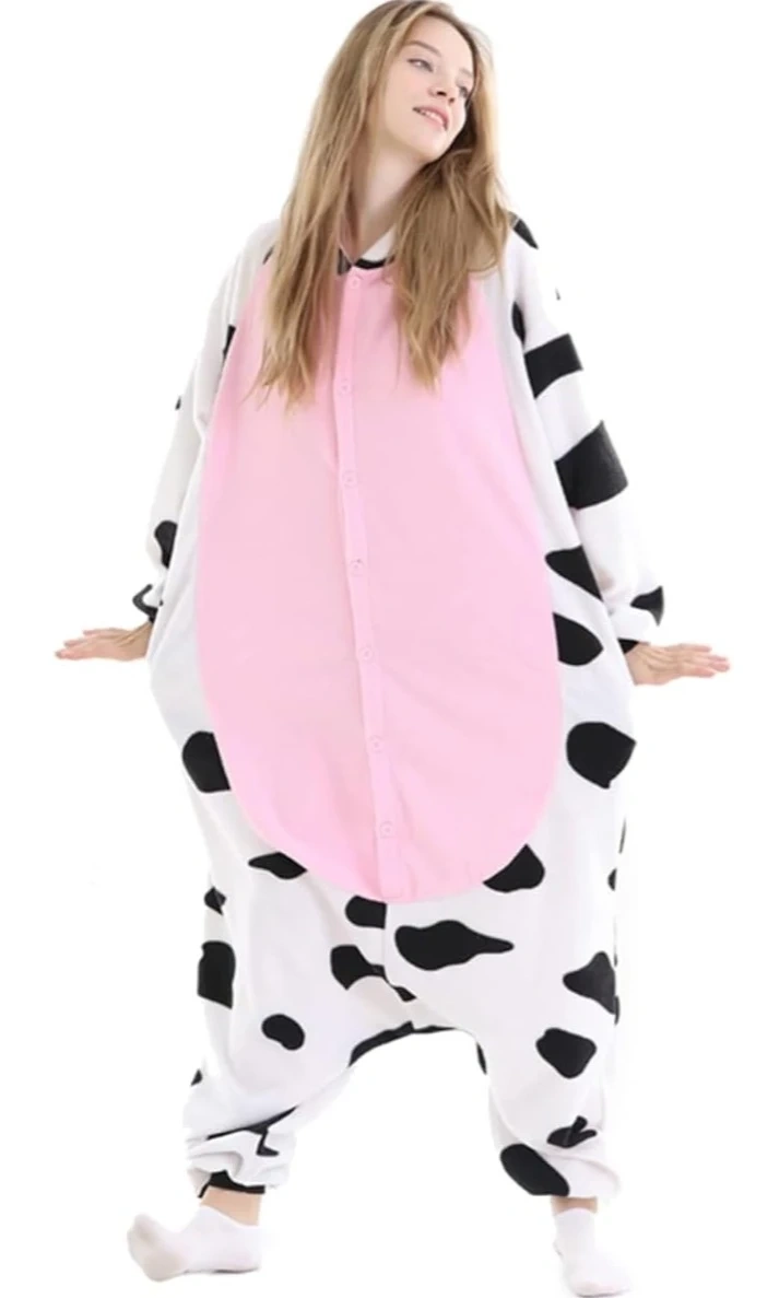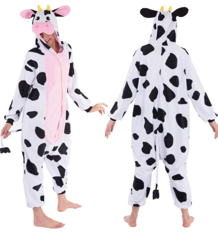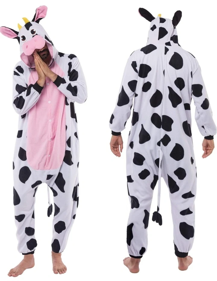 Cozy and warm adult unisex cow onesie pajamas made from ultra-soft synthetic material. Perfect for Halloween, Christmas parties, or just lounging around! Machine washable for easy cleaning.
