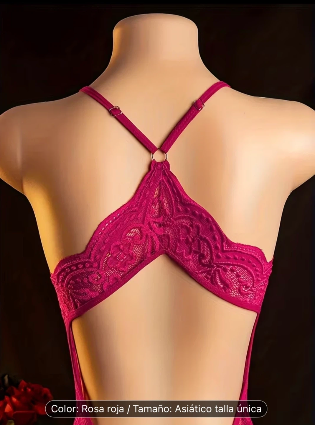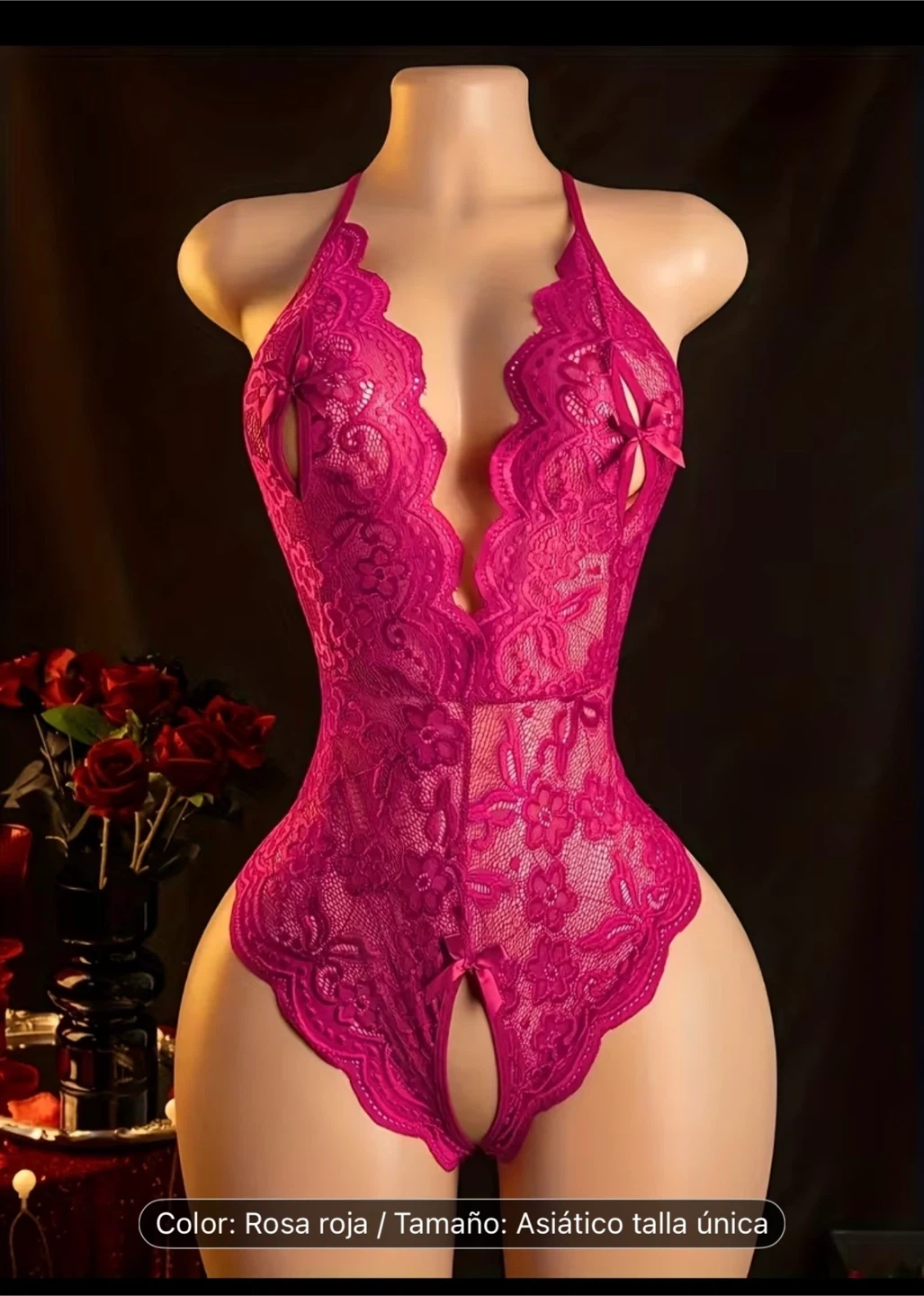 This lace halter teddy features a deep V-neck and intricate floral patterns. It's designed with adjustable straps and a cheeky cutout in the back. Made from a blend of nylon and spandex for a comfortable fit.
