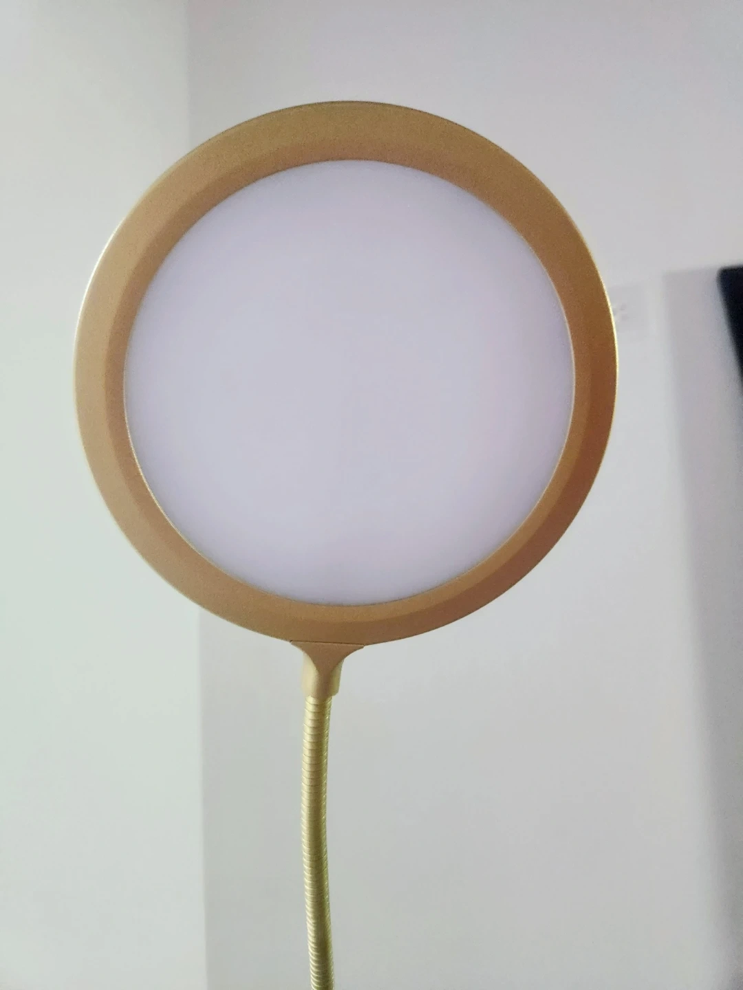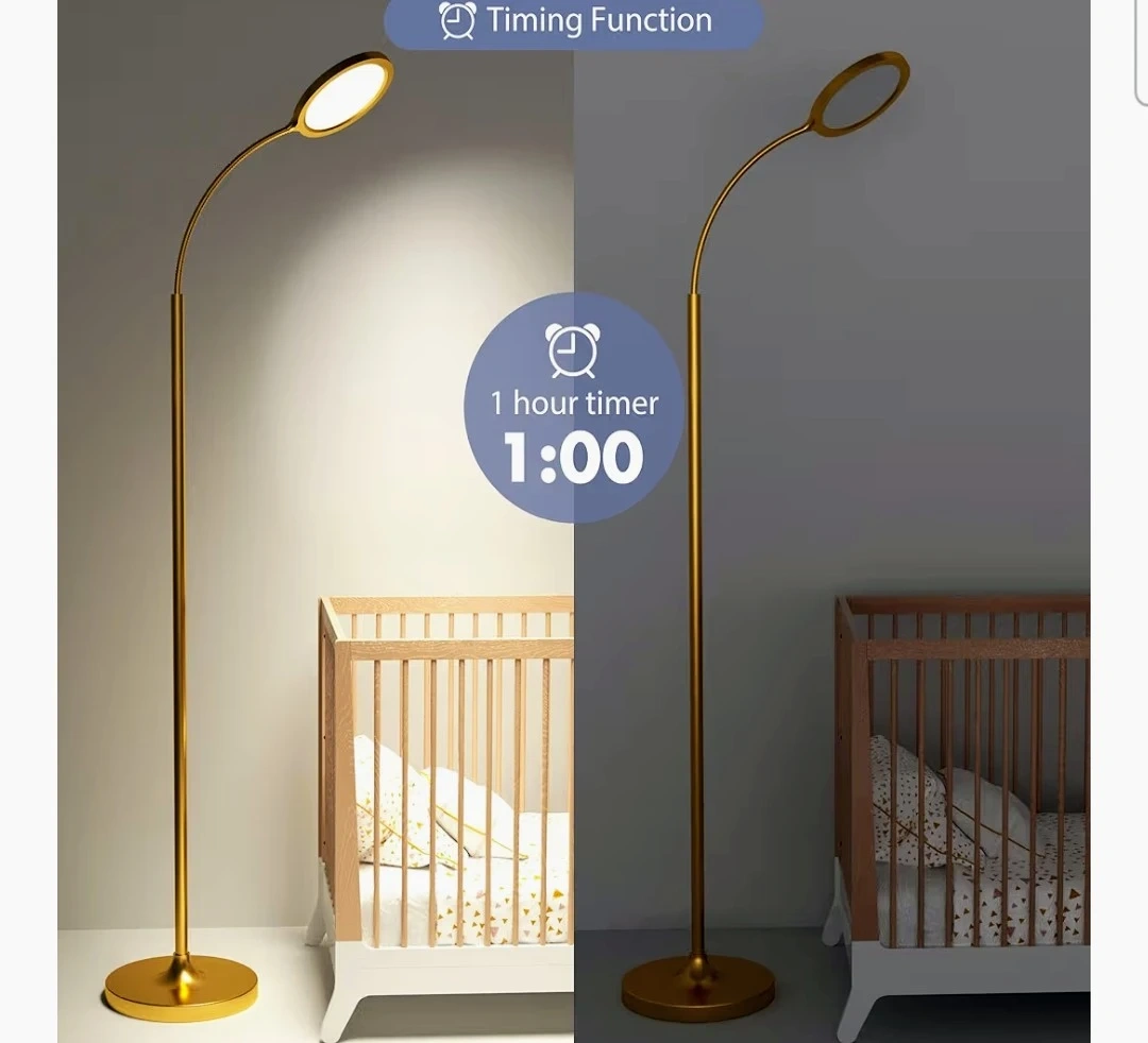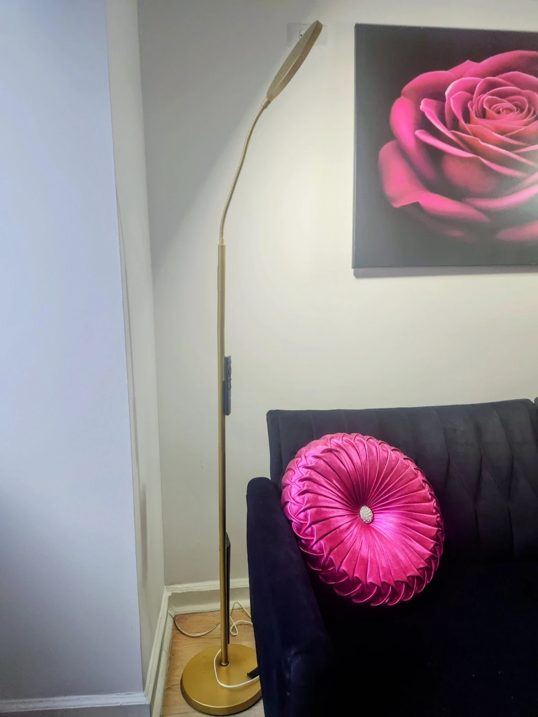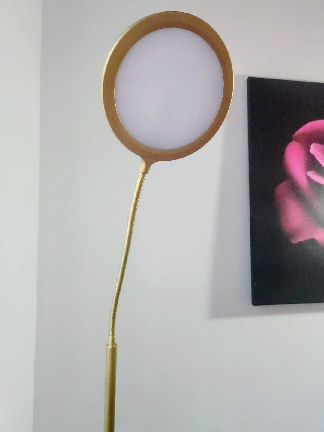 Selling a gold-colored LED floor lamp. It has a circular light and a flexible gooseneck stand. It's perfect for adding some extra light to any room! Modern and sophisticated.