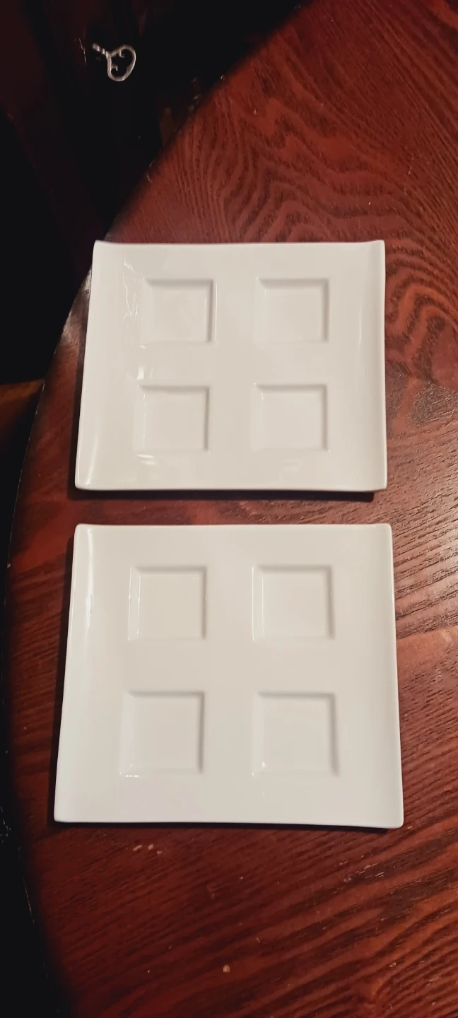 New !! These are two white appetizers/ sushi/ desserts plates. Each plate has four raised sections for serving small items. Great for serving desserts or small snacks! 8"×7". New !! ALL MY PRICES ARE NEGOTIABLE !!