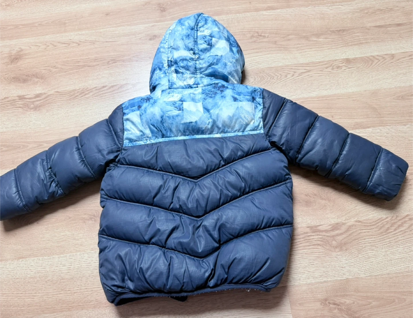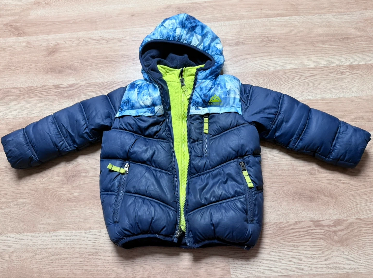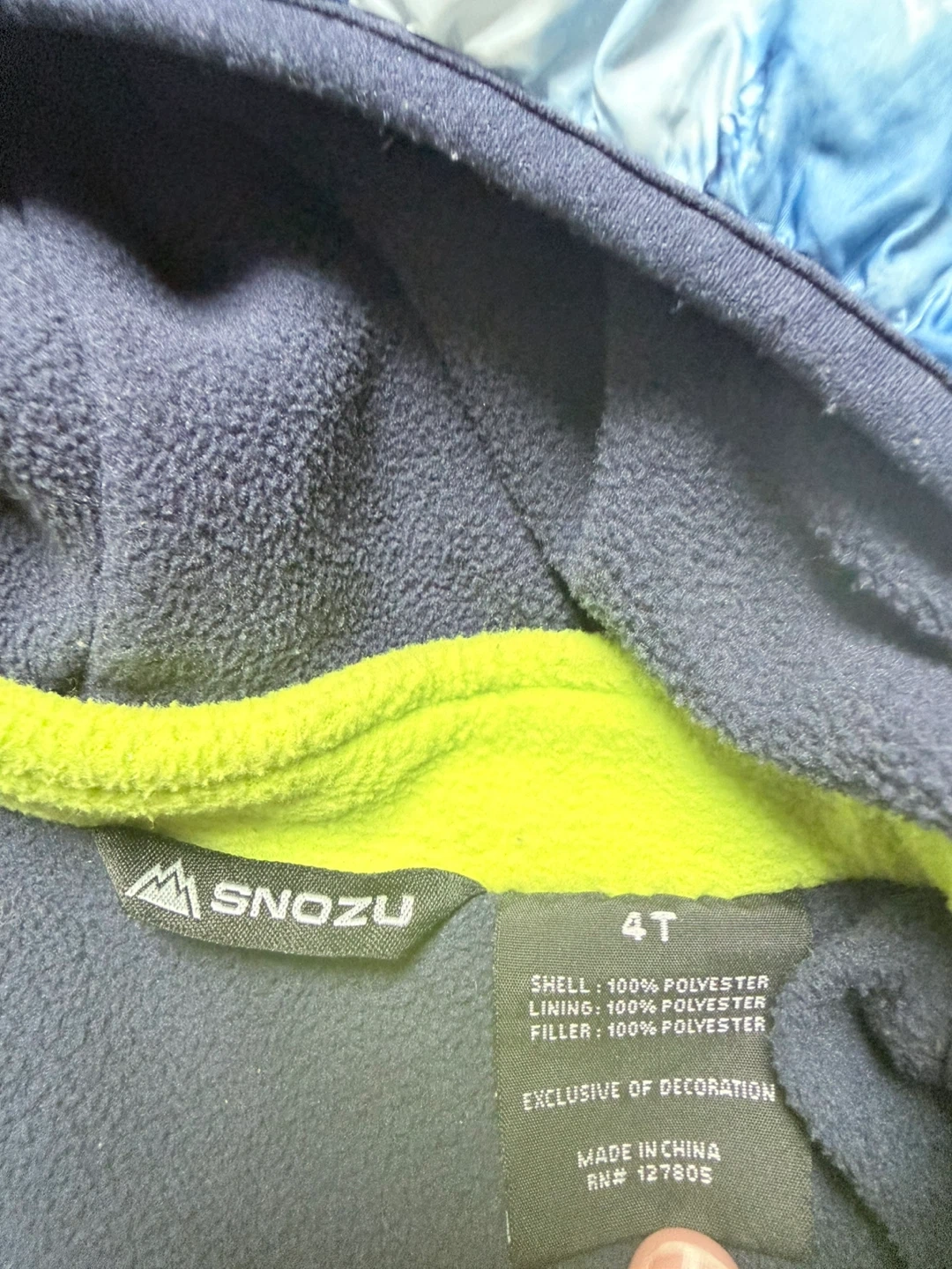 Snozu puffer jacket in navy blue with a bright lime green lining. It's a size 4T. Shell, lining, and filler are all 100% polyester. Great for keeping kids warm!