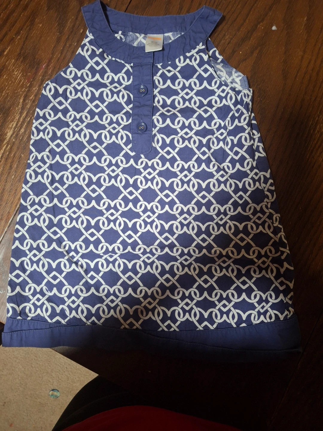 This is a Gymboree sleeveless dress with a blue and white interlocking geometric pattern. It has two buttons at the neckline and a solid blue hem. It's a cute option for warm weather! Size 5T