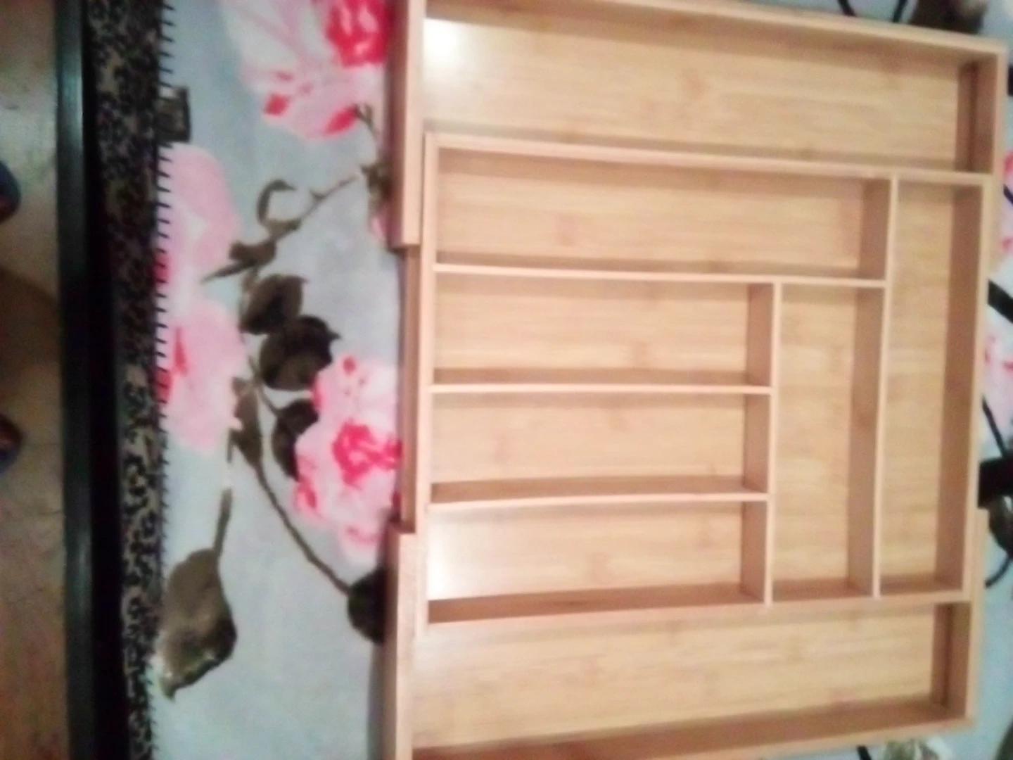 Here's a bamboo drawer organizer to help keep things tidy! It has a natural wood color and several compartments.