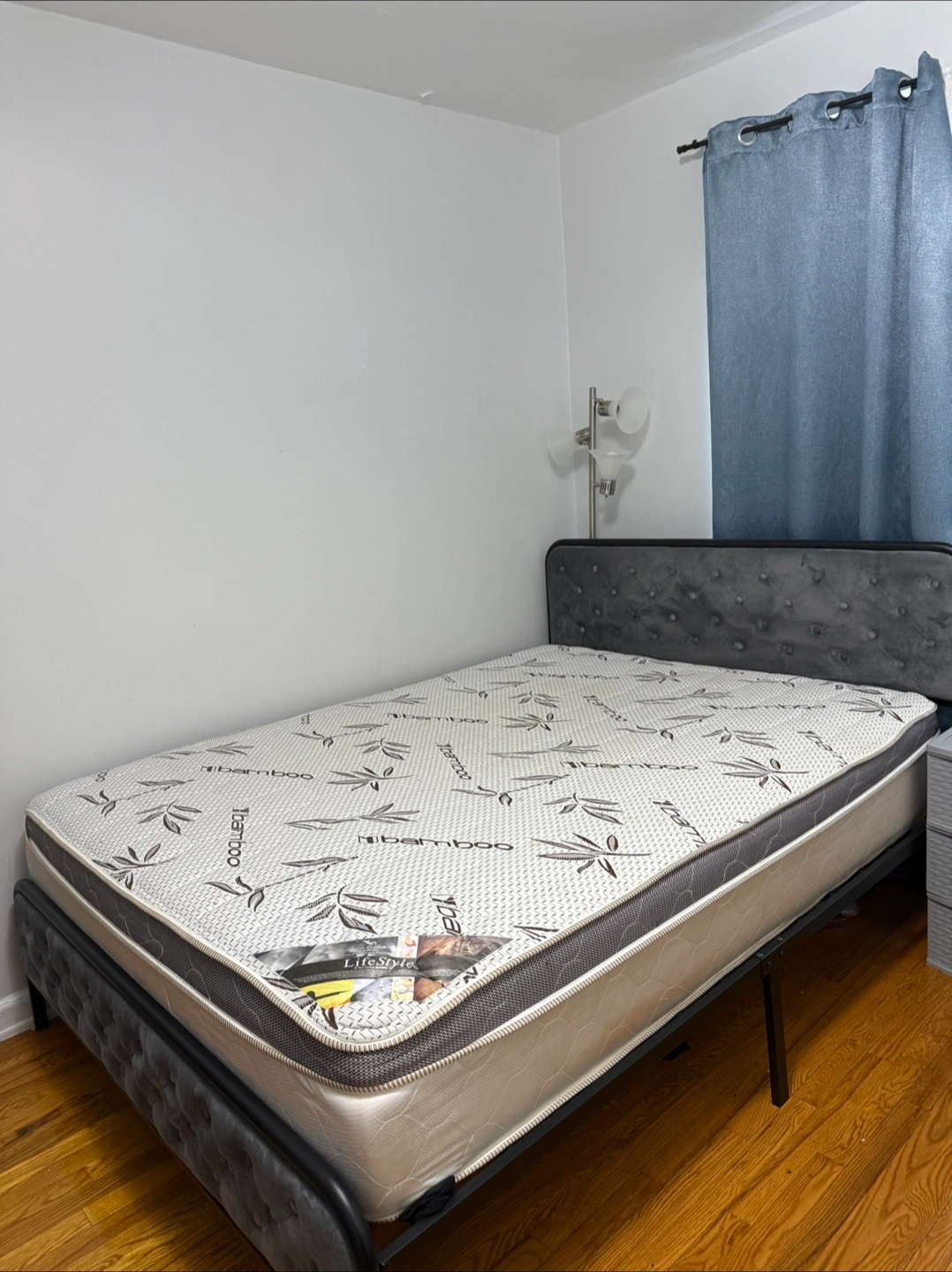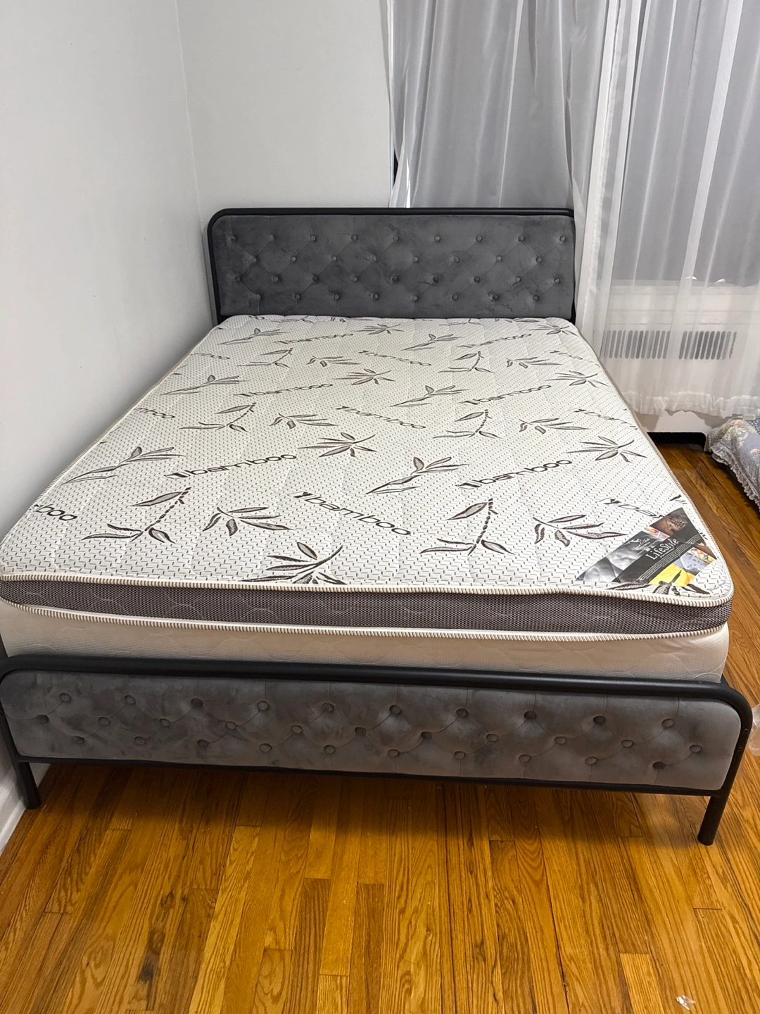 Bed frame with a grey upholstered headboard and footboard. Features a mattress with a unique pattern, a white border, and a tag on the corner. Consider this bed for a relaxing night of rest. Orthopedic mattress from bed