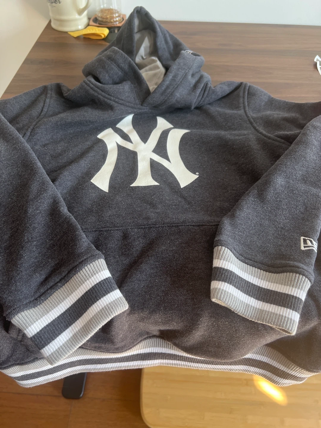 This is a New Era New York Yankees hoodie. The hoodie is gray with the iconic Yankees logo on the front. It's perfect for any fan of the team!