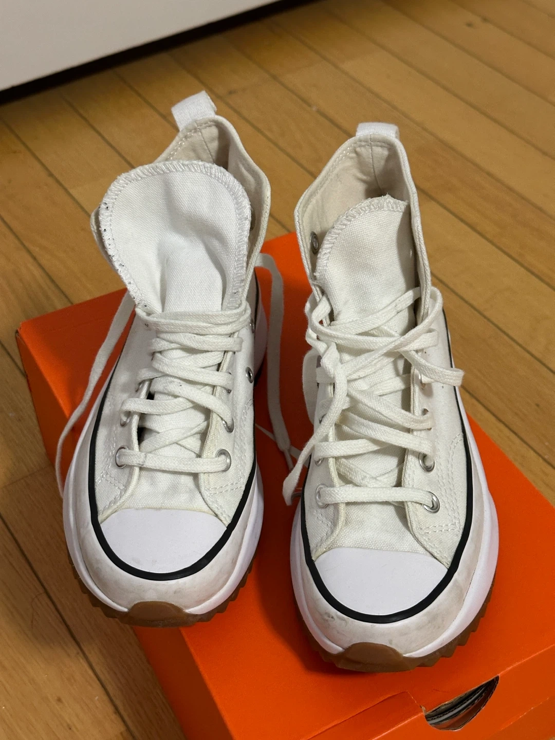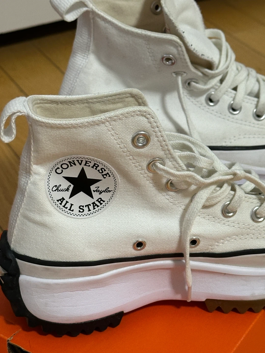 These white Converse Chuck Taylor All Star sneakers feature a platform sole and high-top design. Made with a textile upper and rubber sole. Available in women's US size 6.