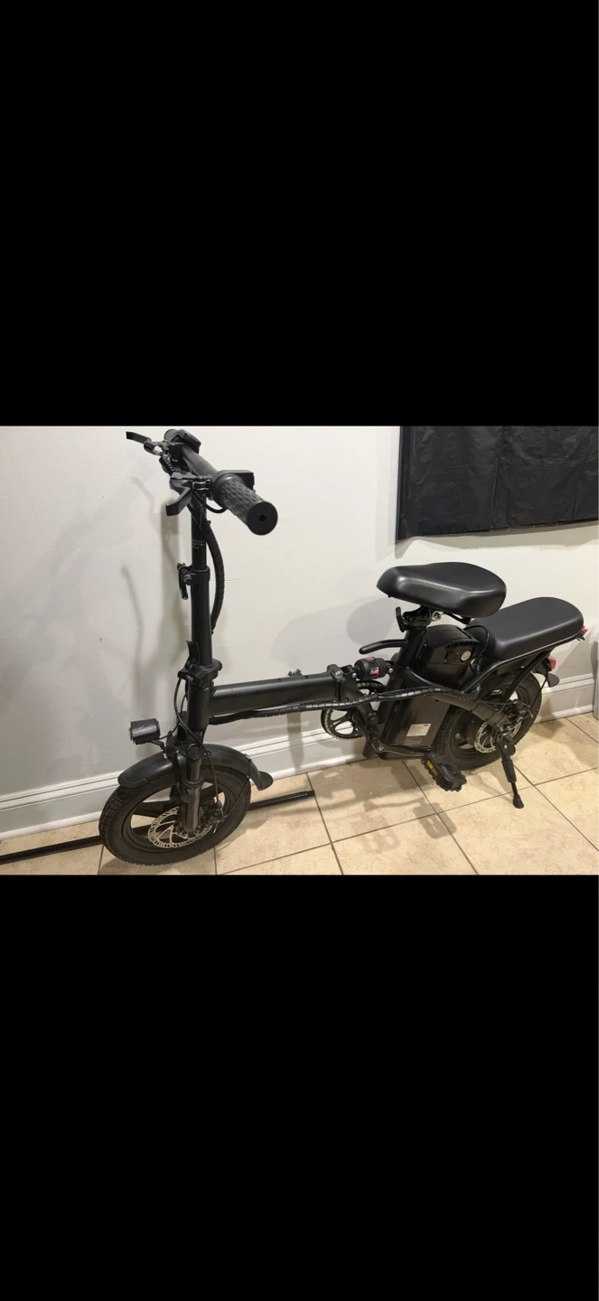 This is a black folding electric bike. It features a sturdy frame and comfortable seating. The bike folds for easy storage and transport. It's a great option for commuting or recreational rides!