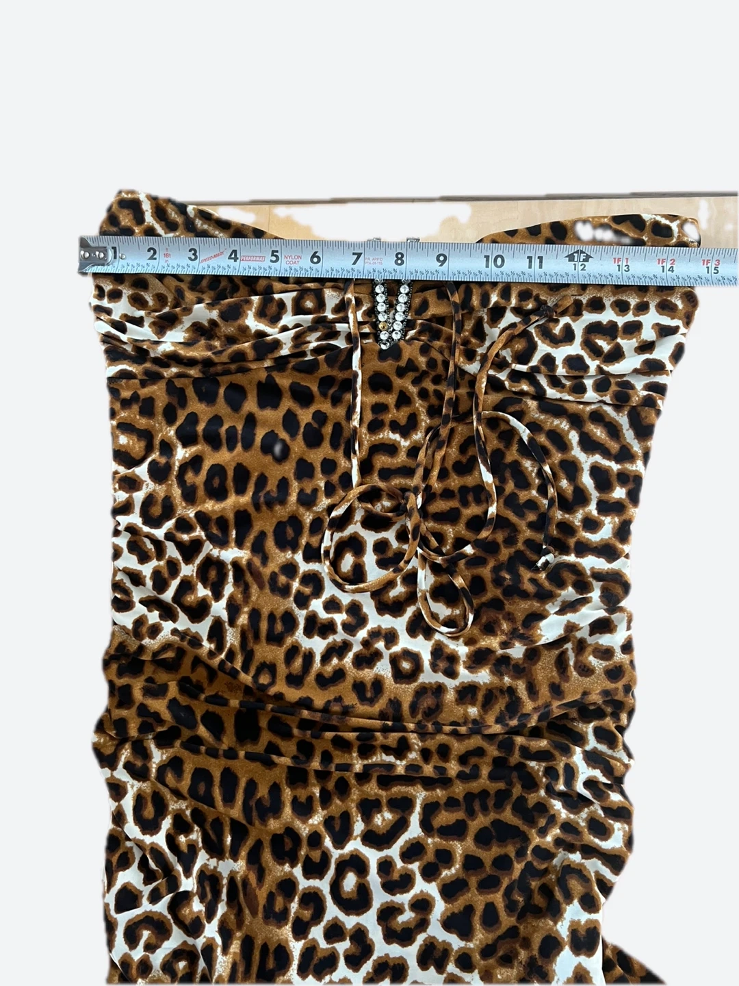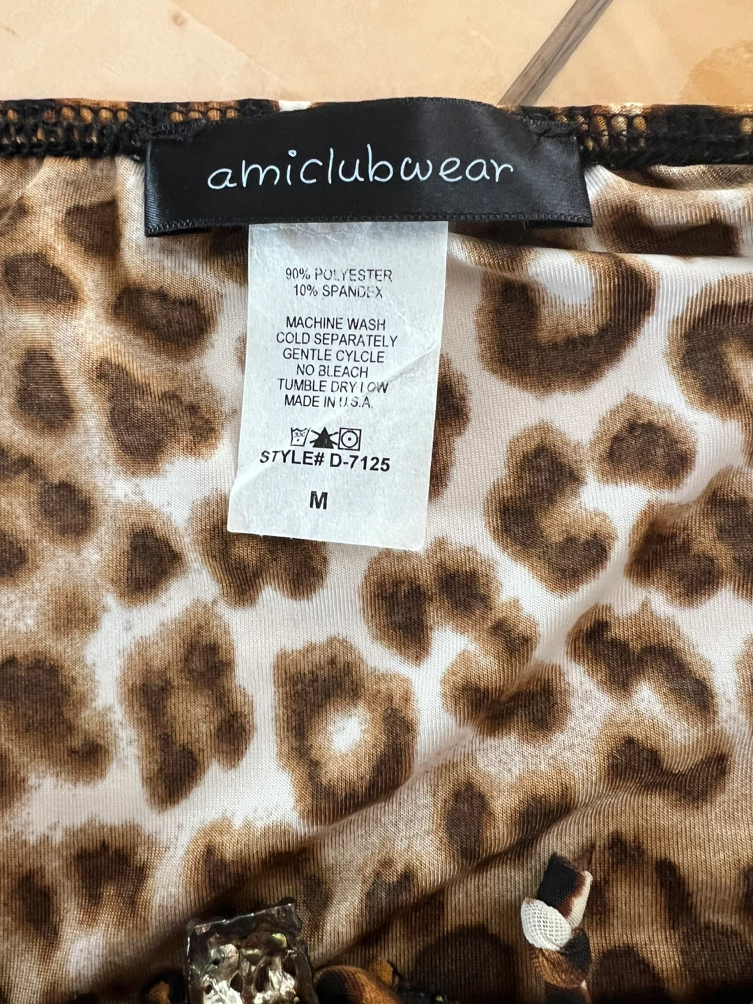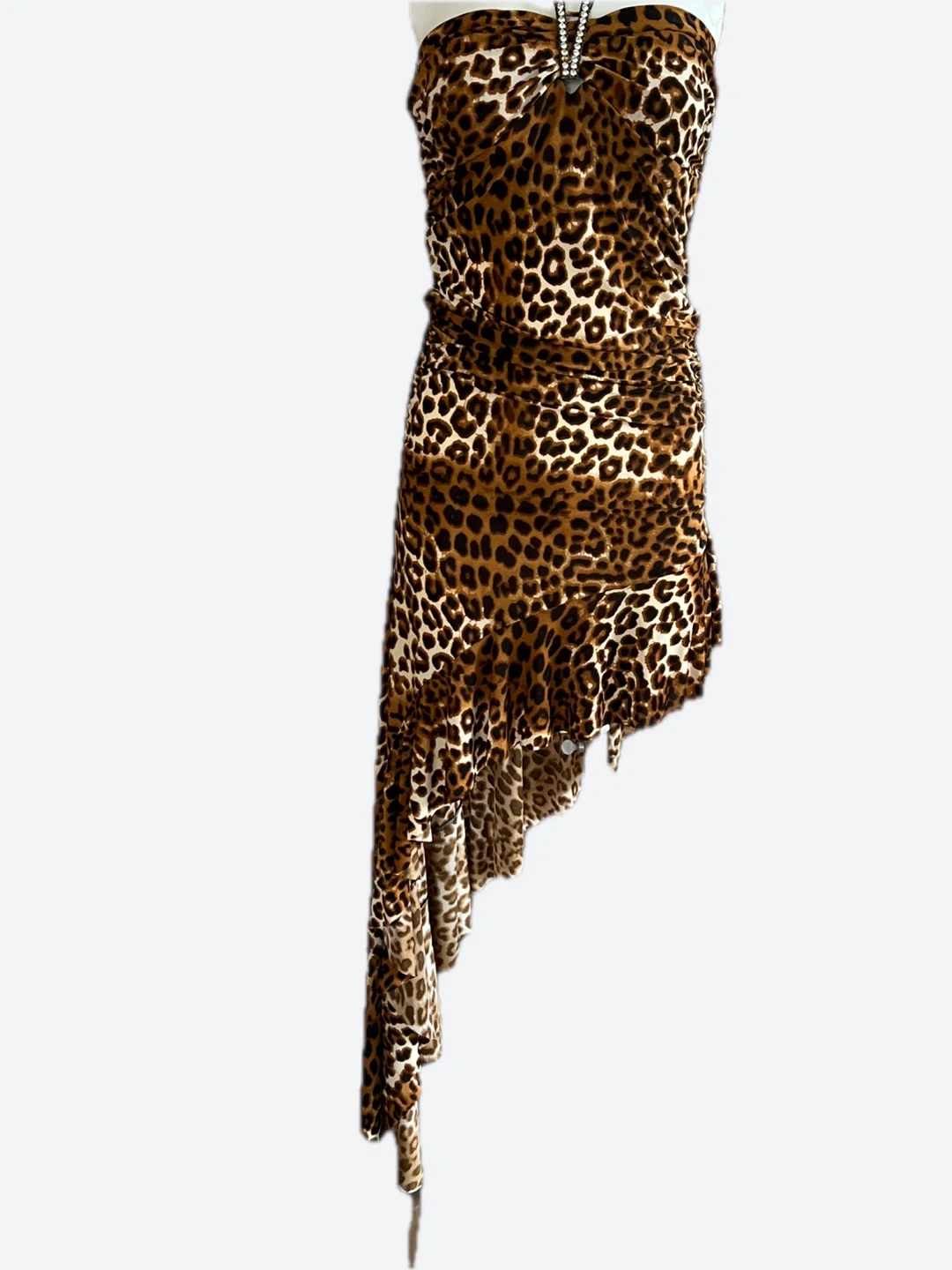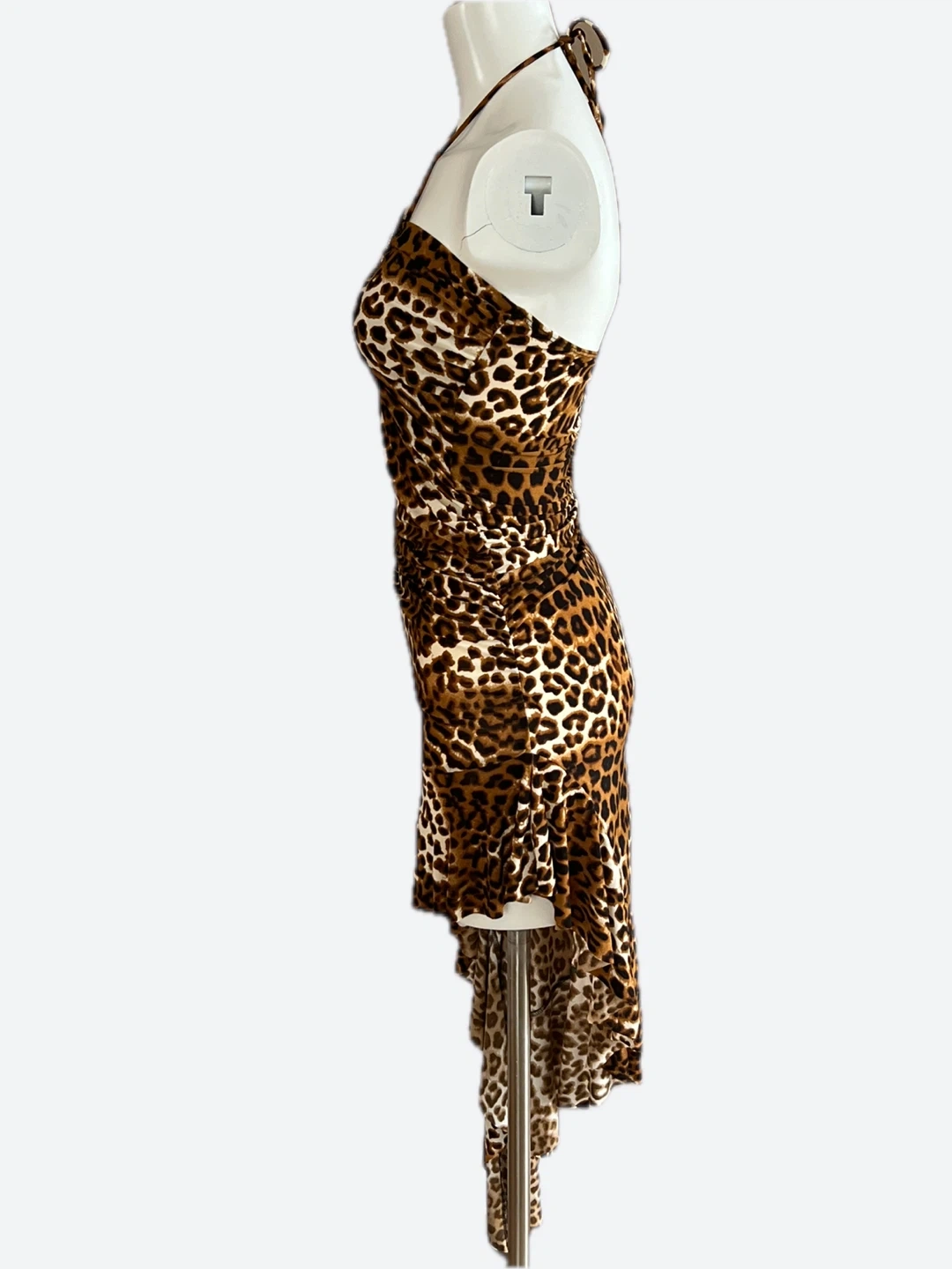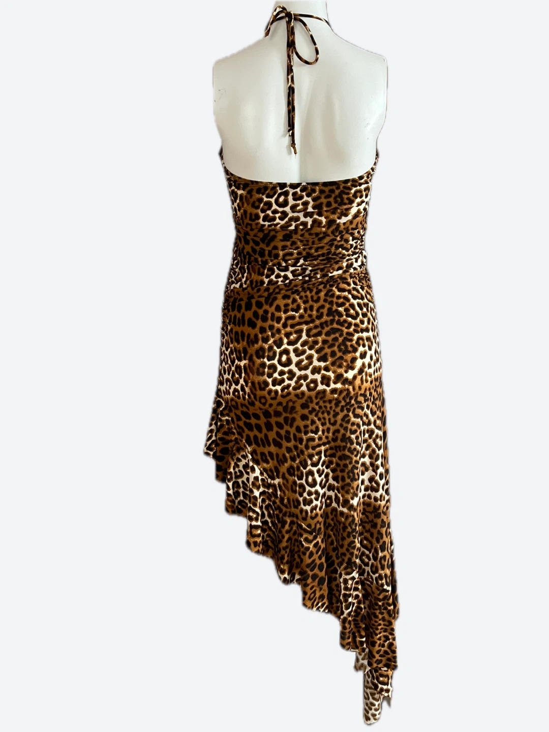 This Amiclubwear dress features a leopard print with a halter neckline and an asymmetrical hem. It's made of 90% polyester and 10% spandex. Care instructions: machine wash cold, gentle cycle, no bleach; tumble dry low. Made in U.S.A. Size M. The right side is about 4F long.