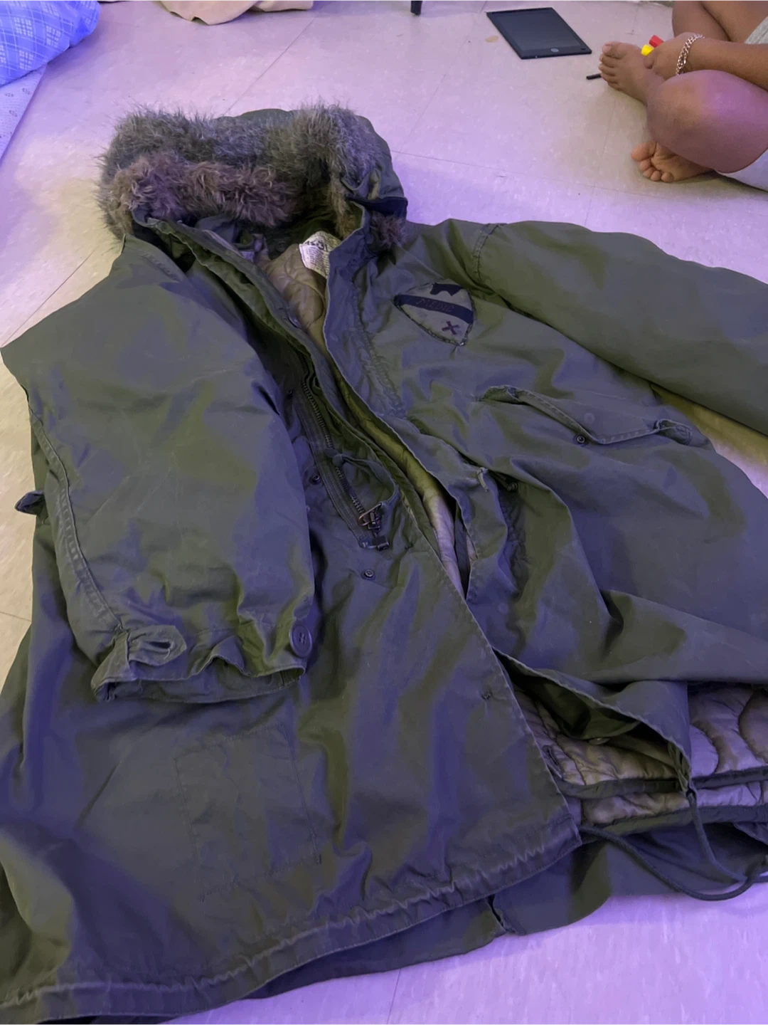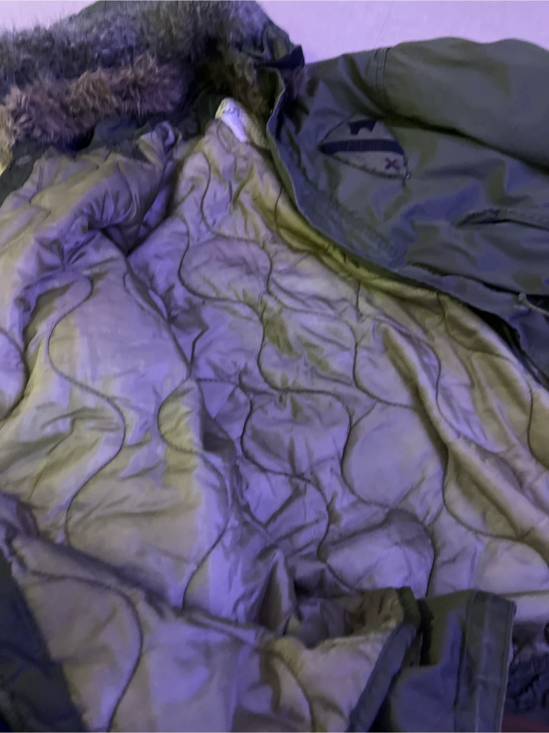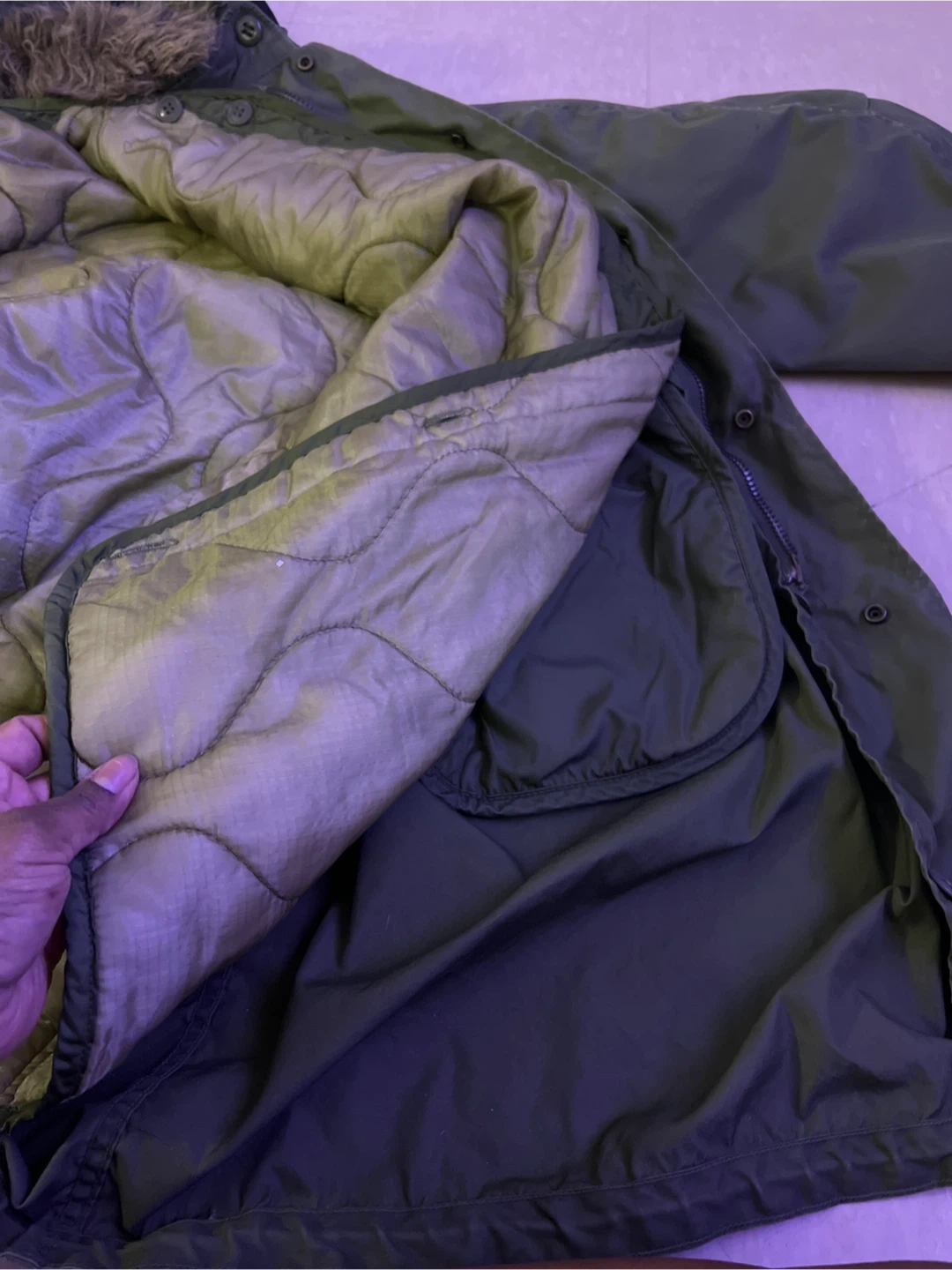 Selling a gently used olive green military parka. It's in great condition and perfect for the colder weather. The parka features a quilted lining for extra warmth and a fur-trimmed hood. It has a classic military style with multiple pockets. Size small but can fit up to large