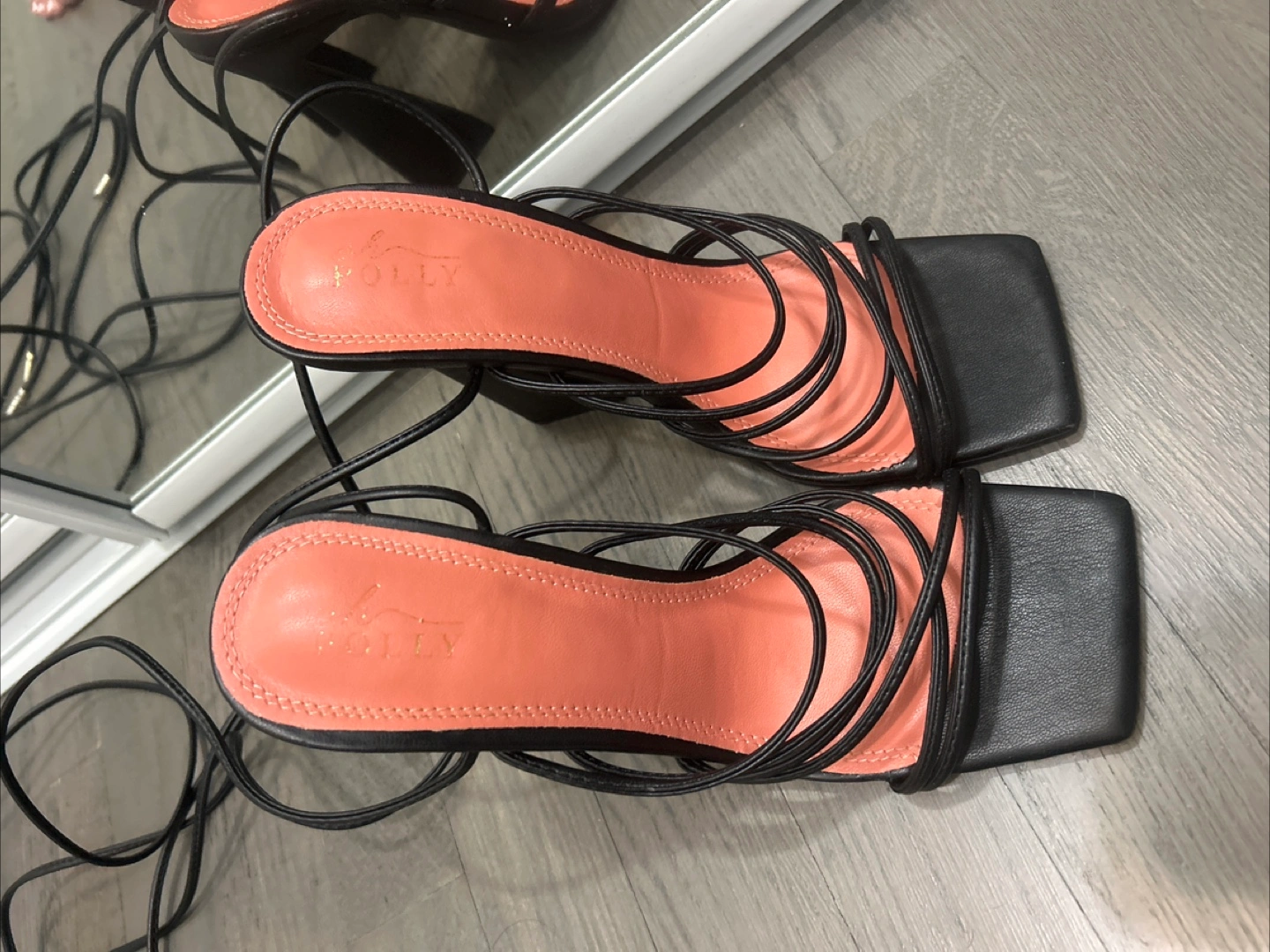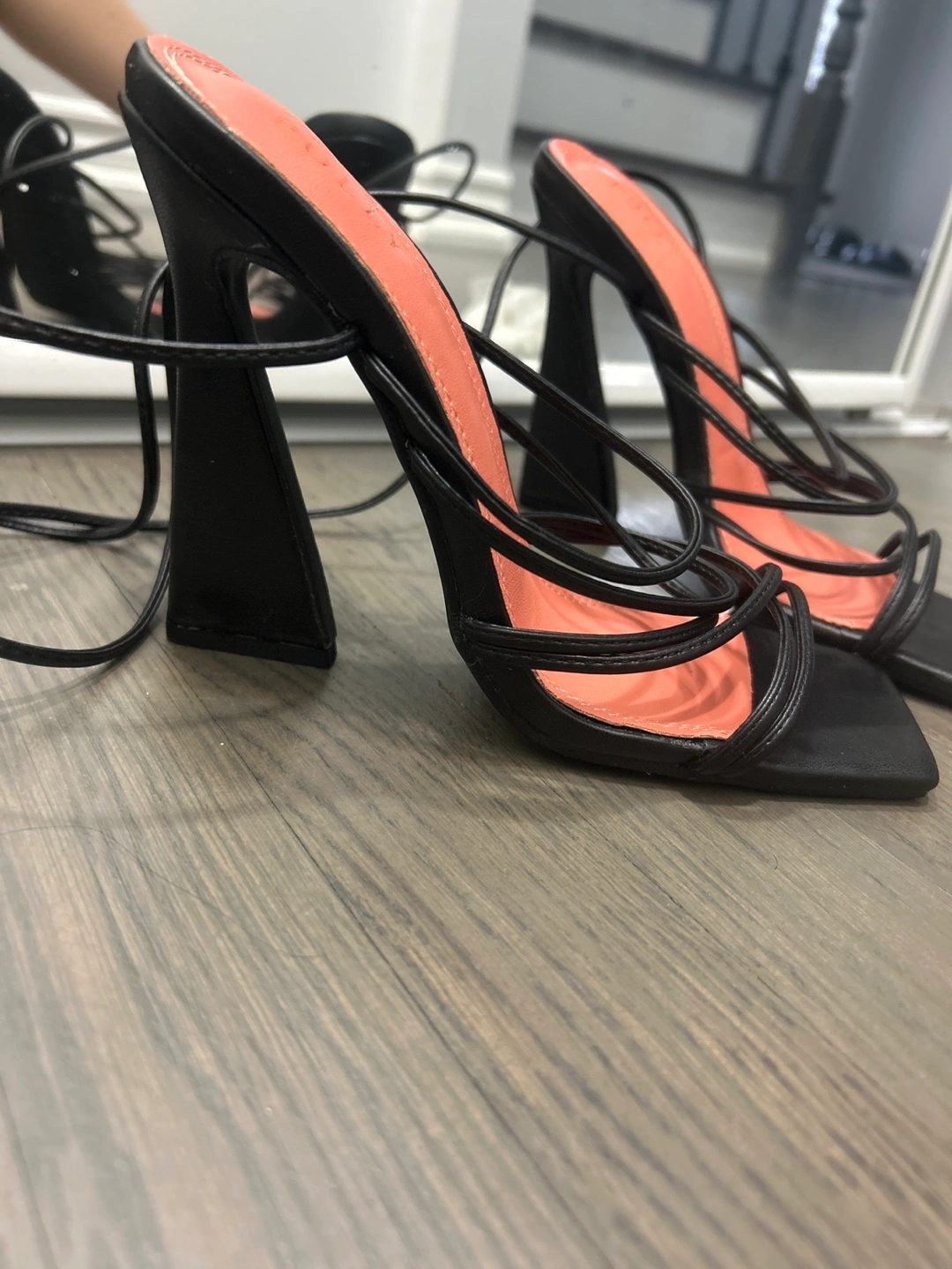 Selling a pair of black heels from Oh Polly. They are a size 7 and feature a strappy design that wraps around the ankle or up the leg. Great for a night out! Only worn once. Comes with box and dust bag.