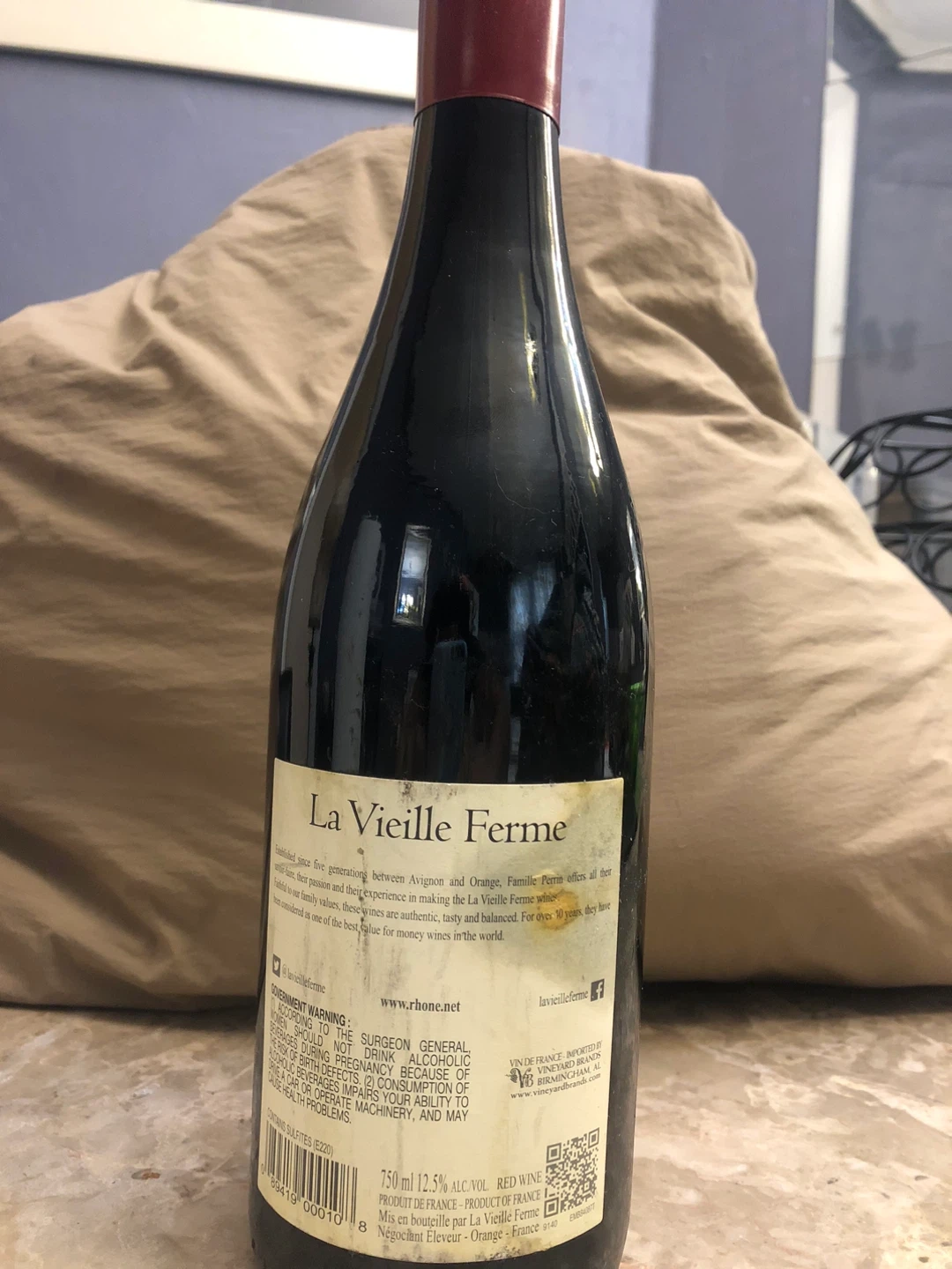 Selling a bottle of La Vieille Ferme red wine. It's a product of France and contains 750 ml with 12.5% alcohol by volume. This wine is imported by Vineyard Brands.