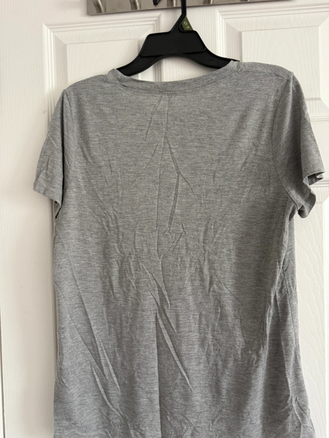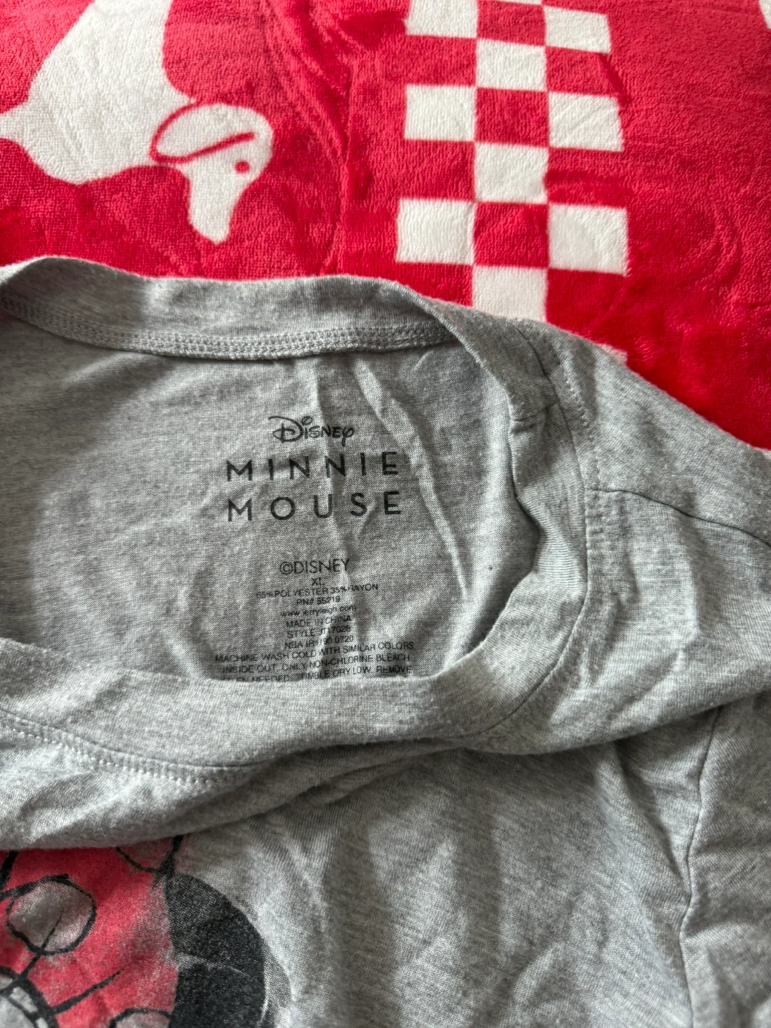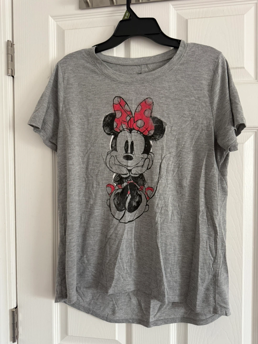 Selling a cute Disney Minnie Mouse t-shirt in size XL! It's a stylish gray color and features a fun Minnie Mouse graphic. The material is 58% polyester, 38% rayon, and 4% spandex, making it comfy to wear. Perfect for any Disney fan!