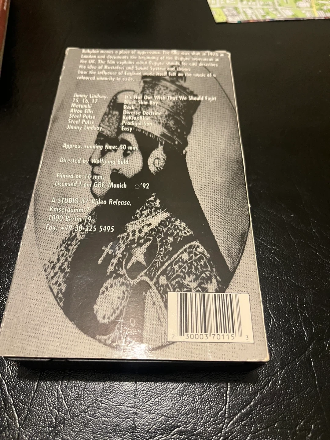 Studio K7 Reggae in Babylon VHS tape, with K7011 catalog number. Directed by Wolfgang Buid. Approx. running time 50 min. Licensed from GRF Munich.