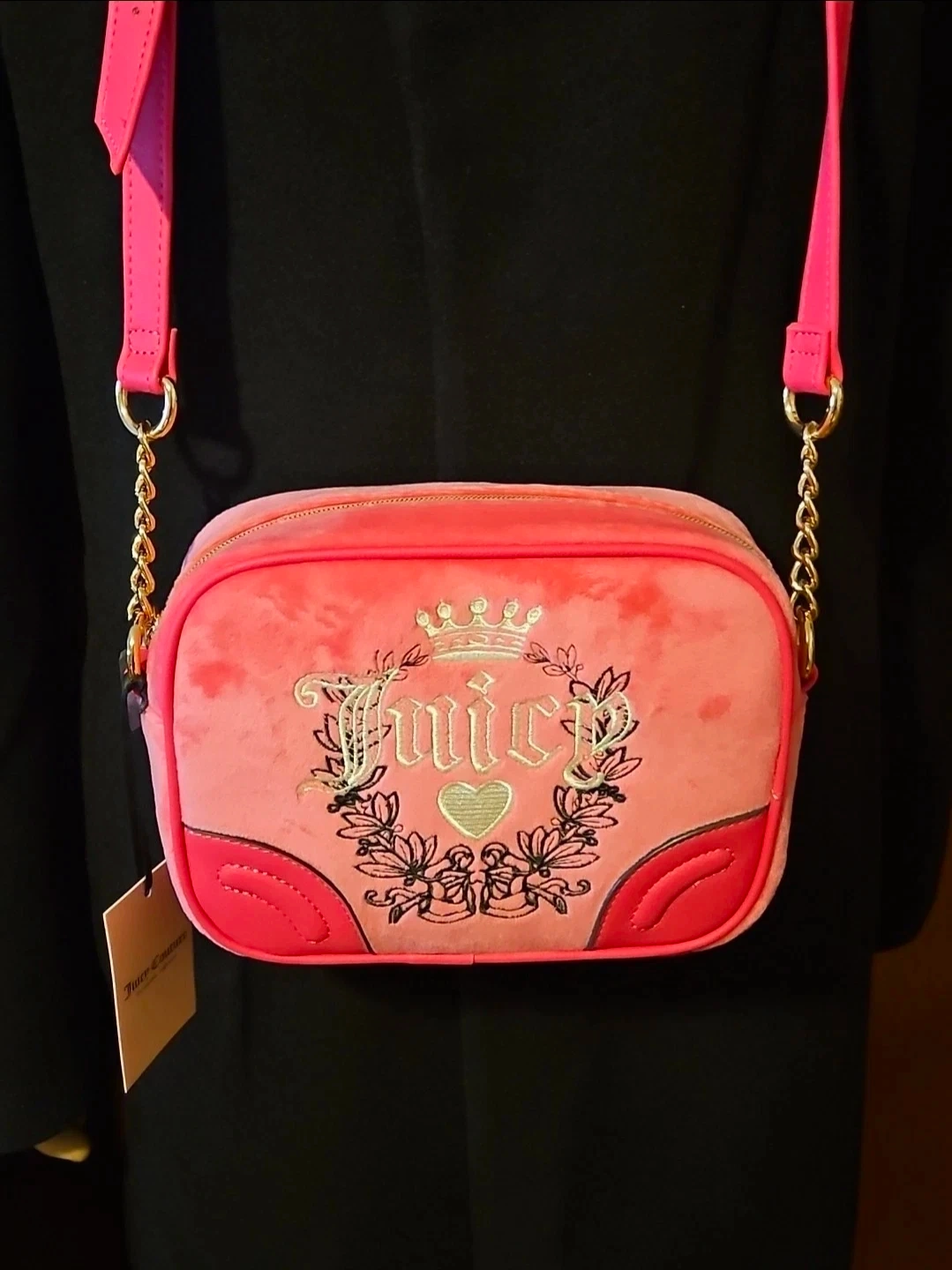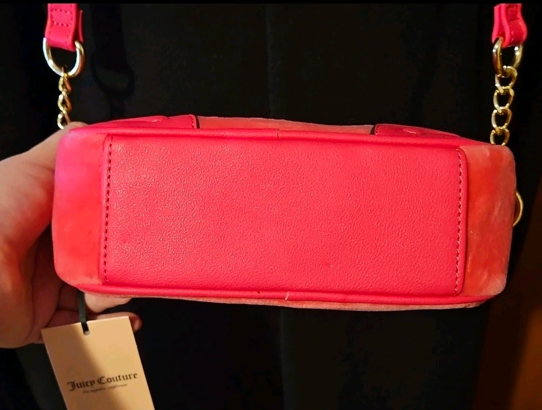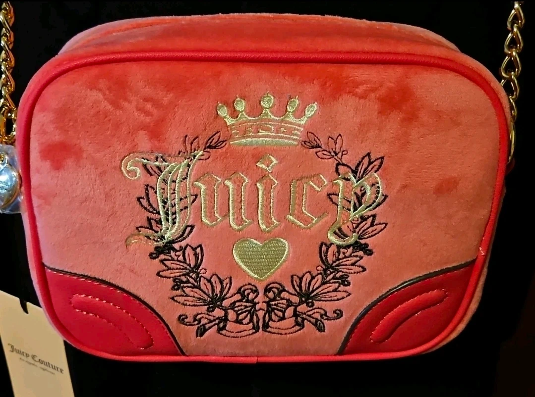 This is a Juicy Couture velour crossbody bag in a vibrant pink hue. It features the iconic Juicy Couture logo with a crown and heart embellishment embroidered on the front. The bag has a gold chain strap and trim, with faux leather accents on the bottom corners. Perfect for adding a pop of colour to any outfit!