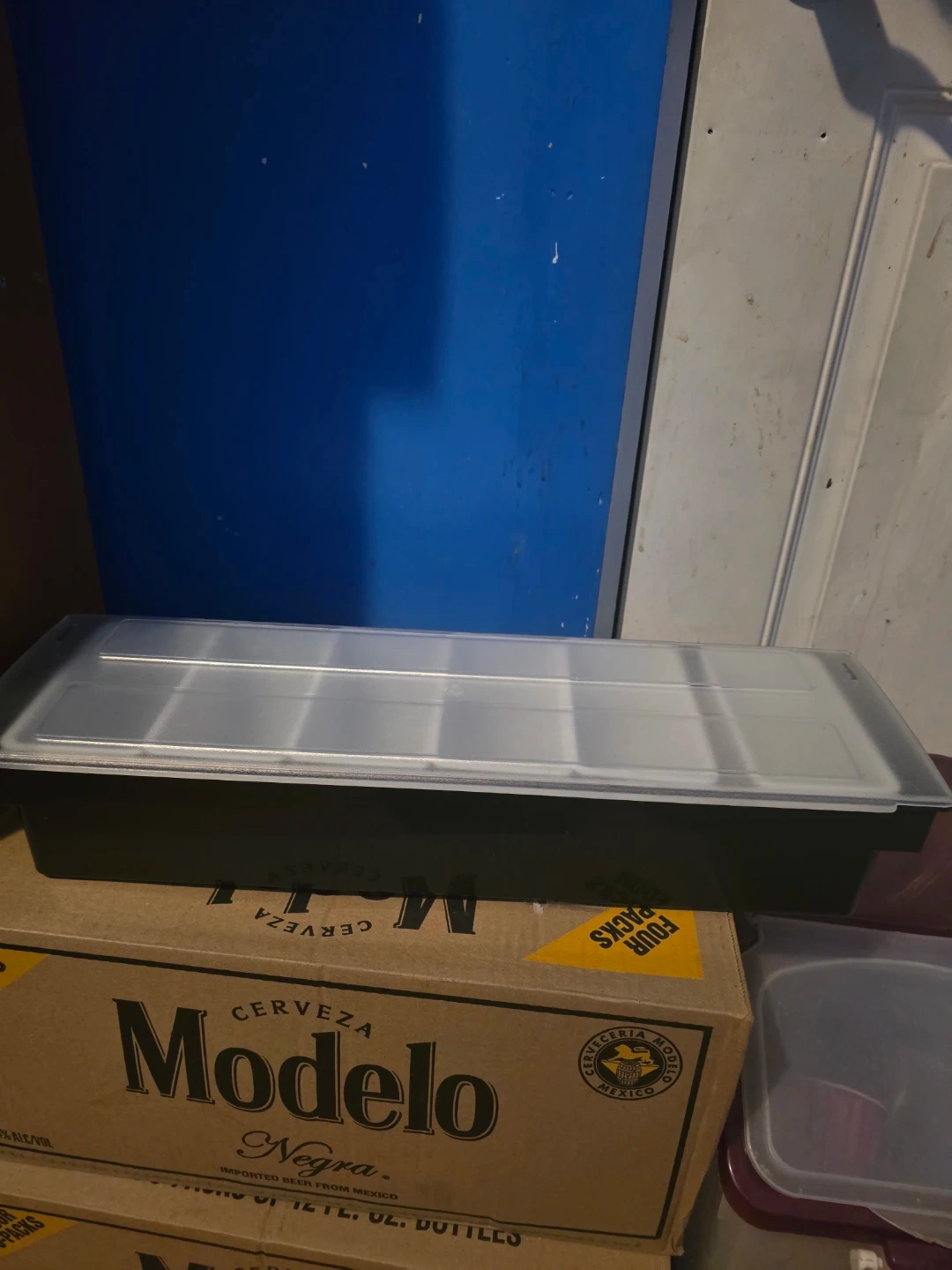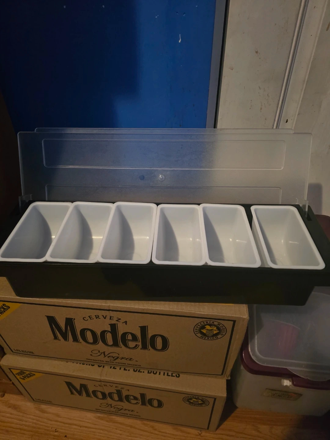 This bar caddy holds up to 6 compartments for your condiments. It comes with a clear plastic lid to keep everything fresh. Great for garnishes and mixers!