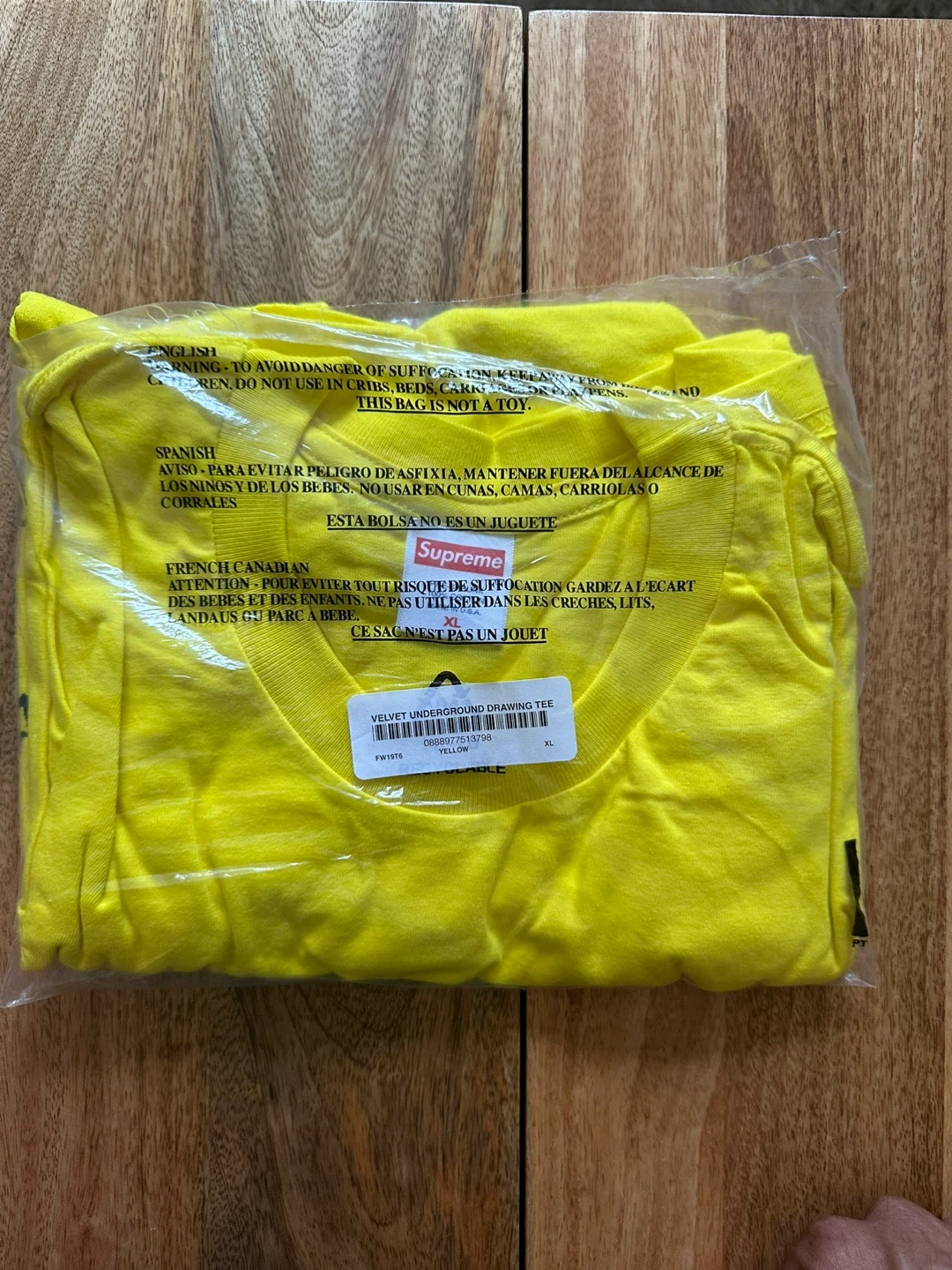 Selling a brand new, still-in-packaging Supreme Velvet Underground Drawing Tee! This is a size XL and comes in a vibrant yellow color. A cool piece to add to your collection!