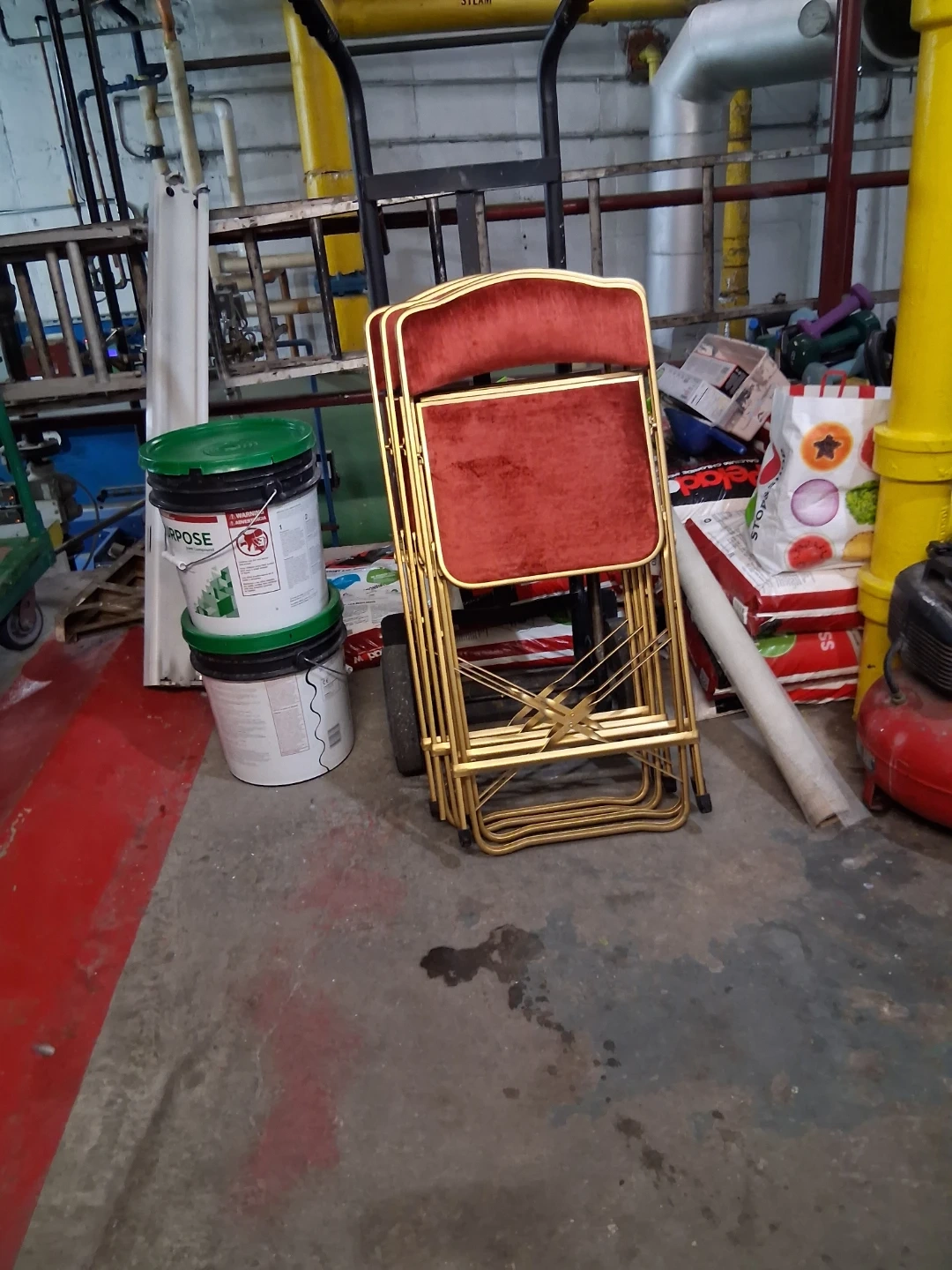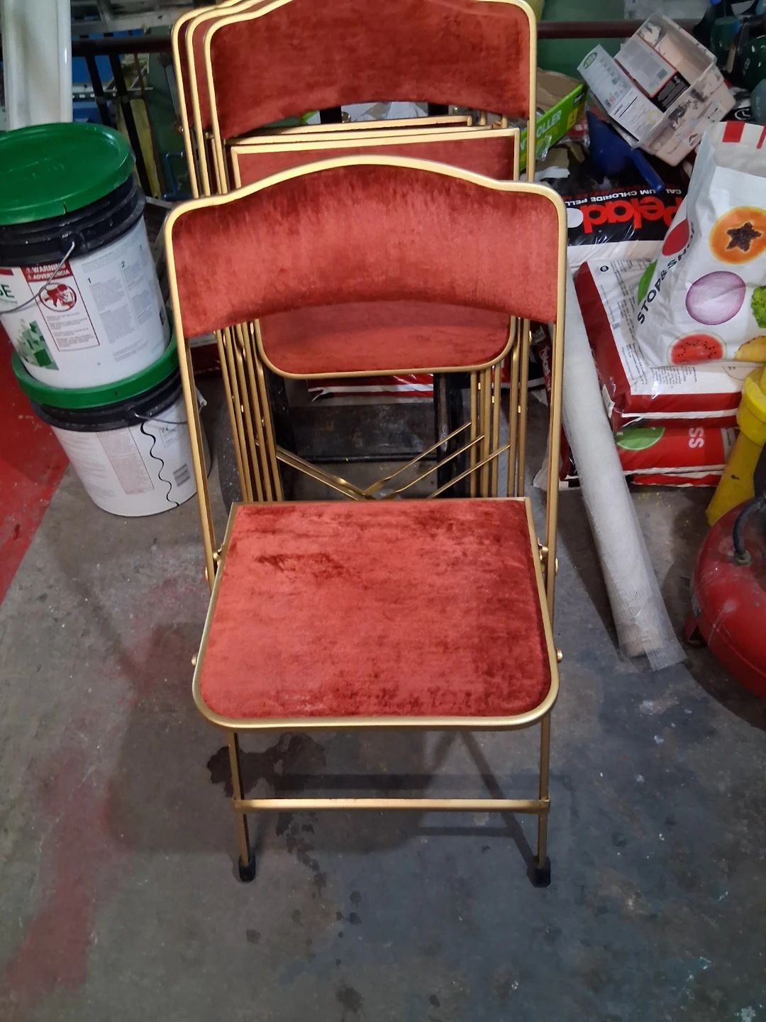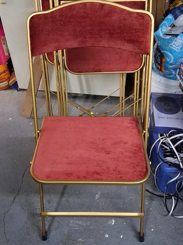 These chairs have a plush red velvet upholstery and a gold metal frame. They fold for easy storage and transport. Perfect for events or extra seating!