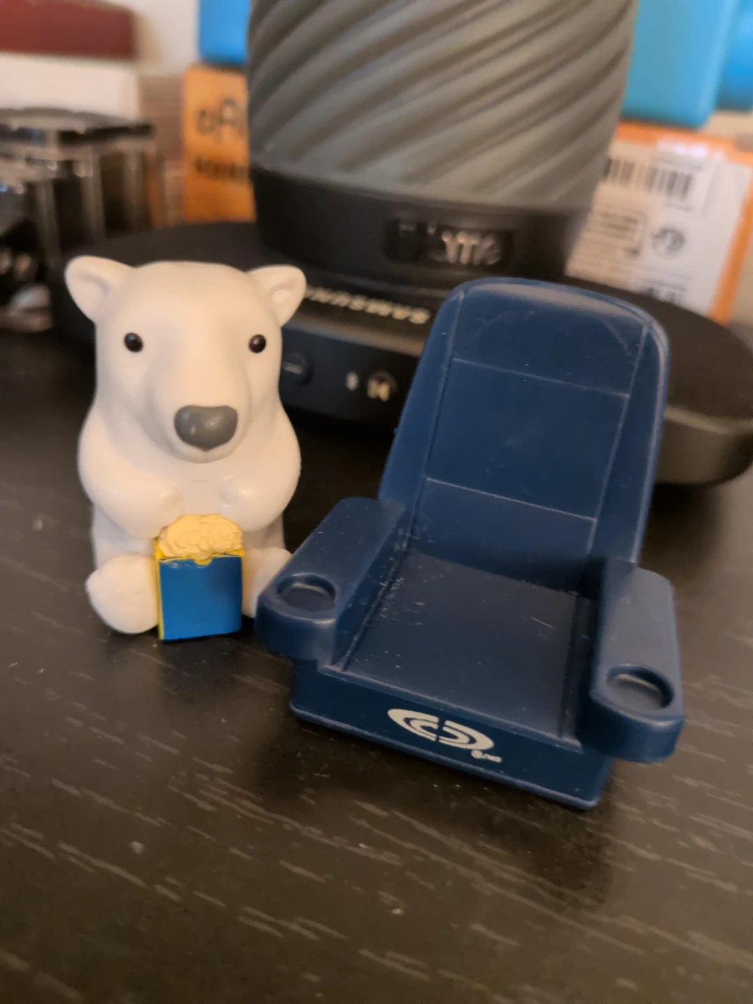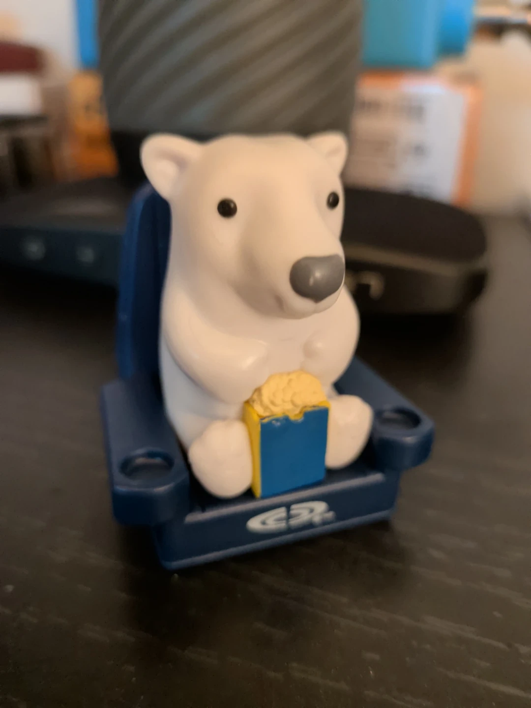 This cute polar bear is sitting in a miniature movie theatre chair with a box of popcorn. It's a fun little desk accessory or collectible item. The chair has a Blu-ray logo on it.