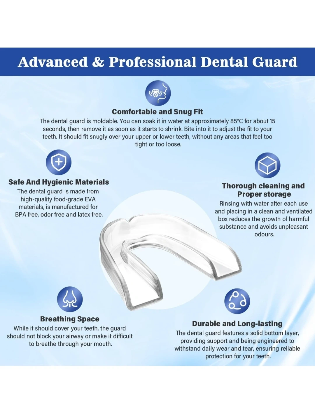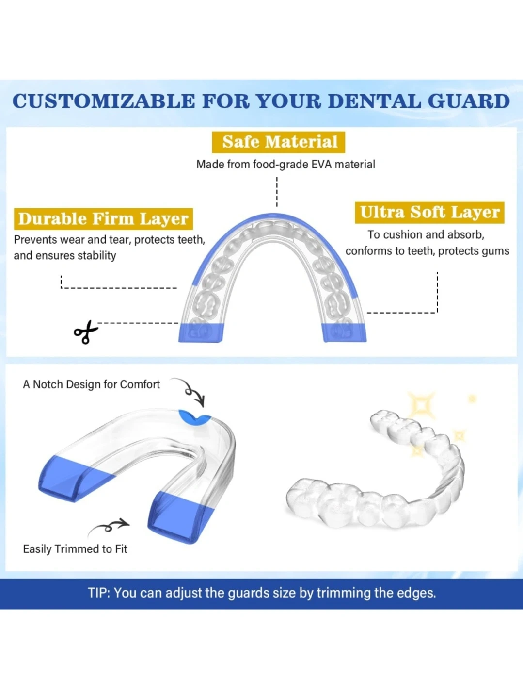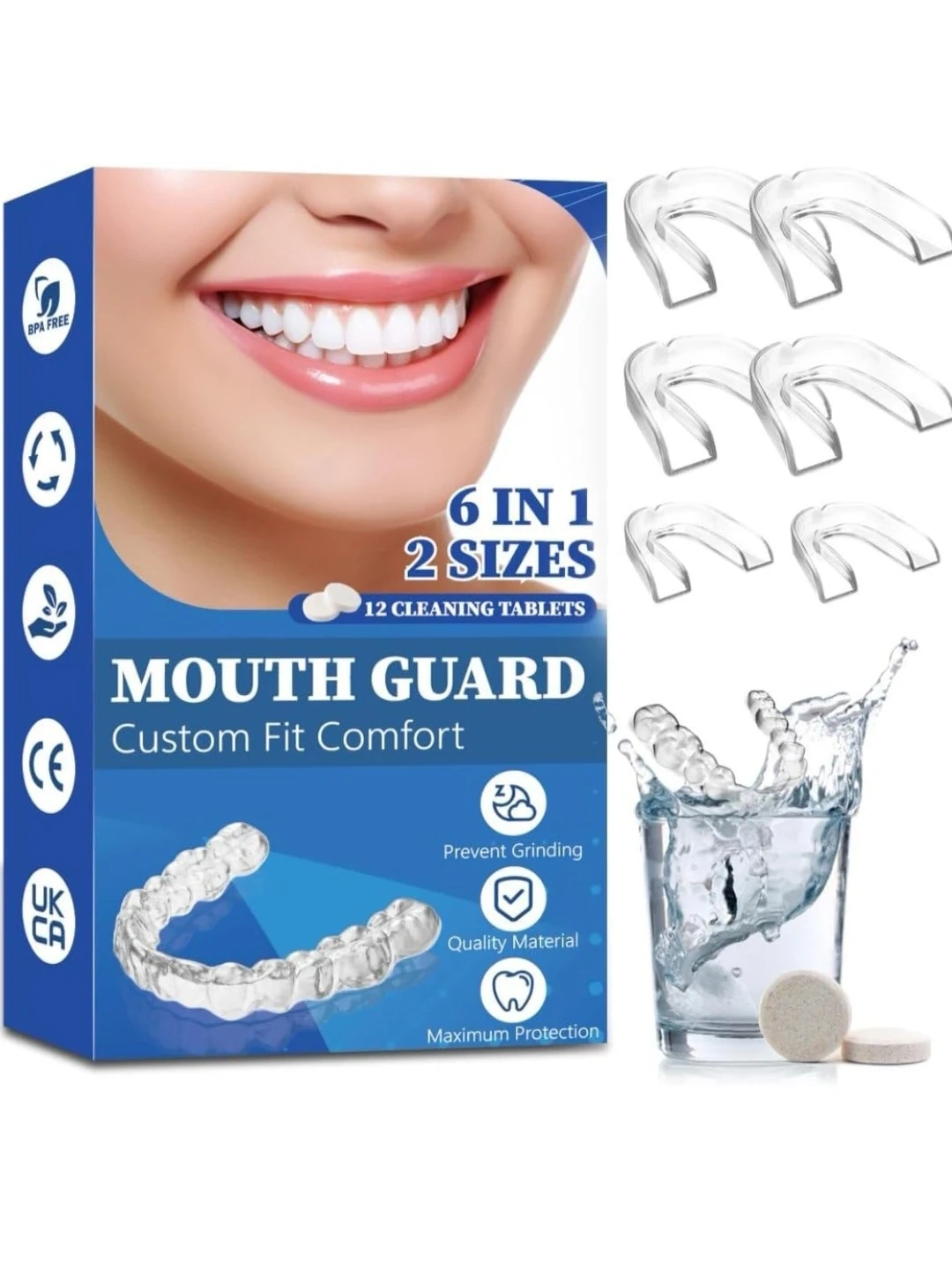 This MITREAL mouth guard set includes 12 cleaning tablets and comes in 2 sizes. It's made from food-grade EVA material with a durable firm layer and an ultra-soft layer for comfort and protection. The guards are easily trimmed to fit and help prevent grinding and bruxism.