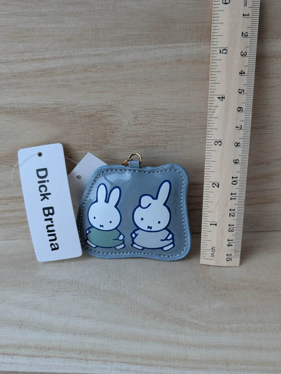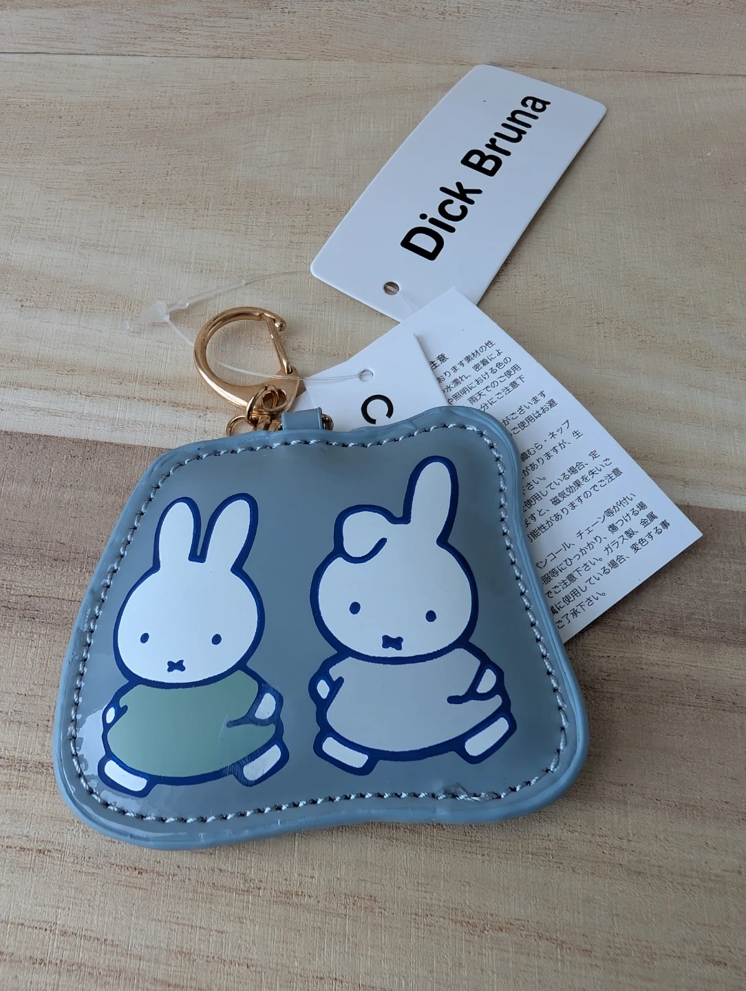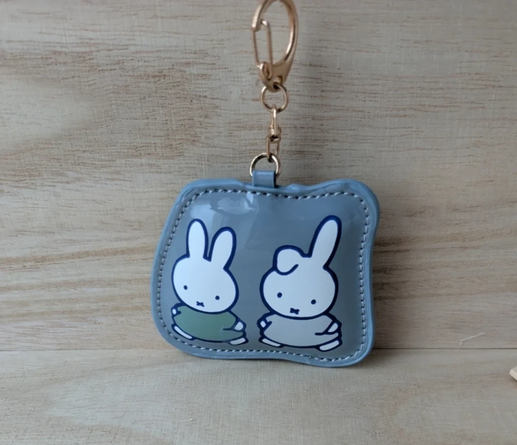 This cute grey pouch features Miffy and Melanie with a gold keyring attachment. It's made of a shiny, durable material. Perfect for keeping small essentials handy on the go!
