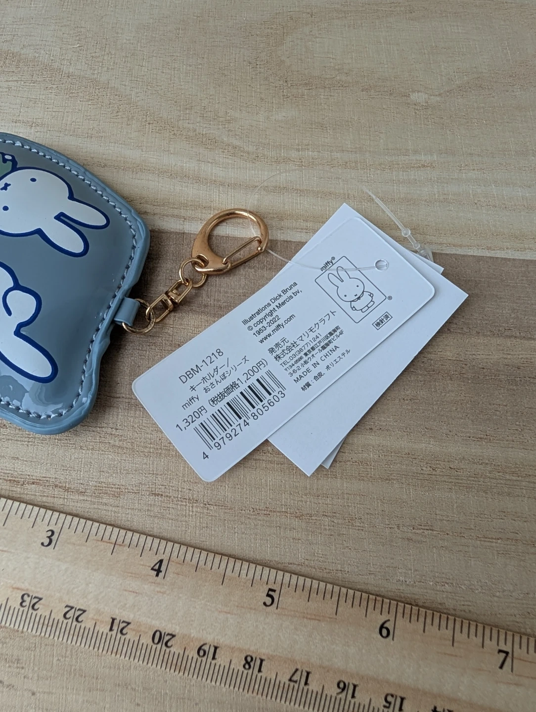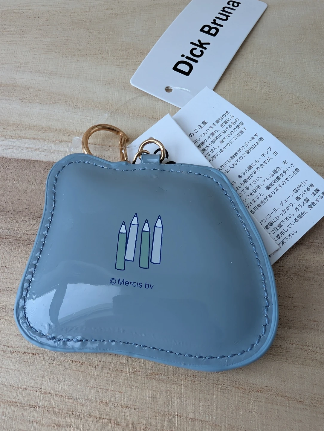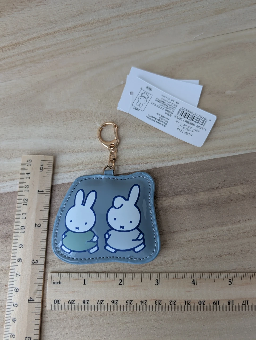 This cute grey pouch features Miffy and Melanie with a gold keyring attachment. It's made of a shiny, durable material. Perfect for keeping small essentials handy on the go!