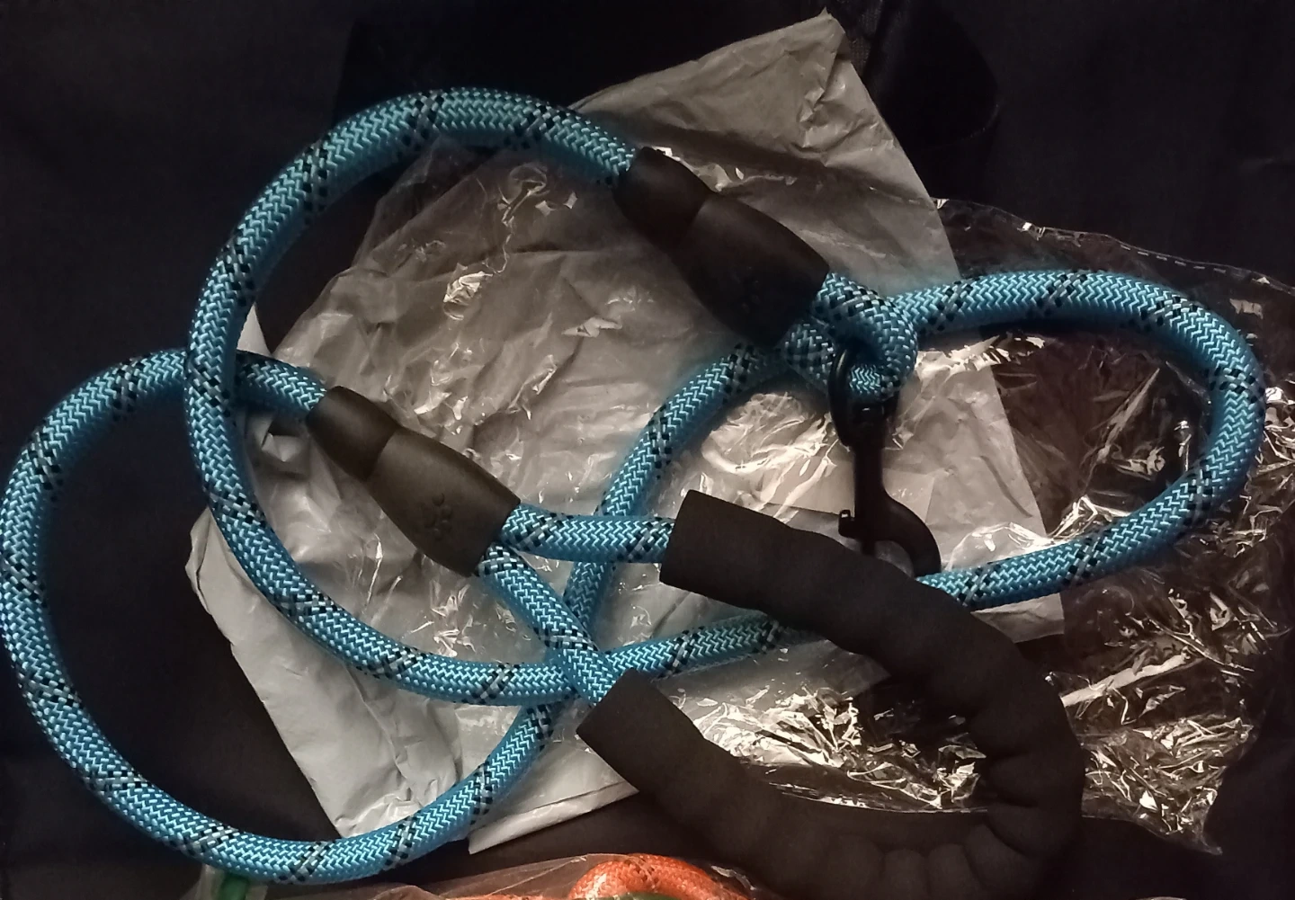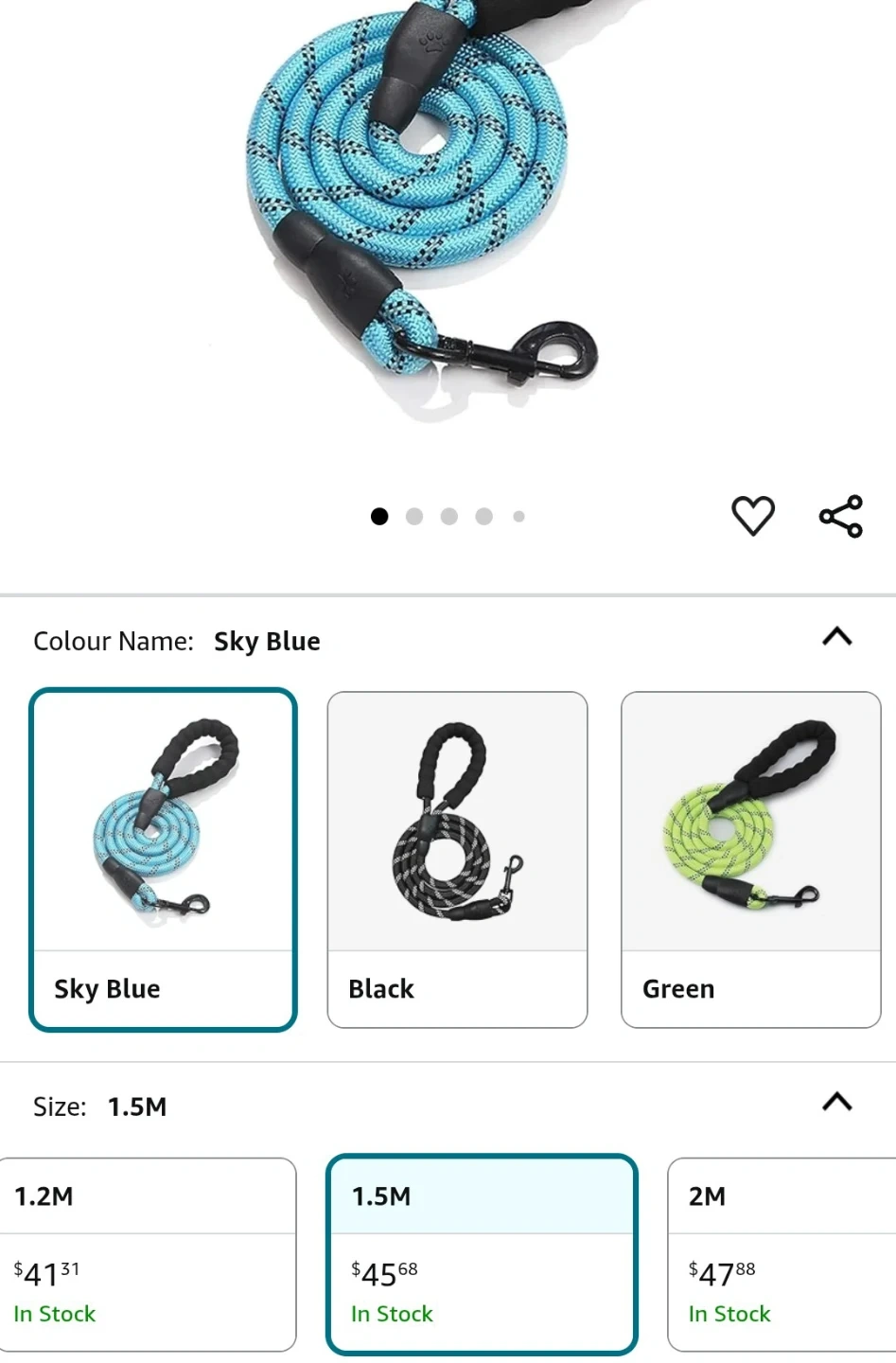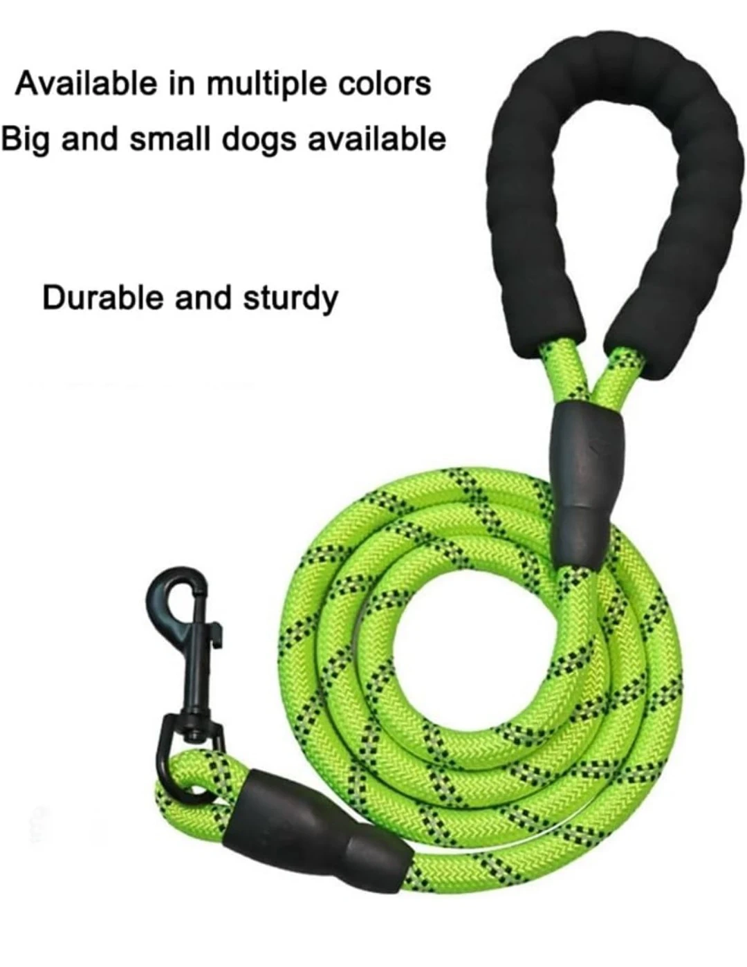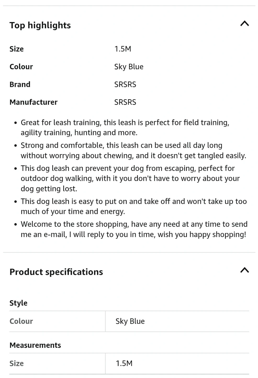 This is a SRS dog leash with a comfortable padded handle. It's 1.5 meters long and comes in a sky blue colour. The rope is durable and sturdy for your pet. It's great for walks with your dog!