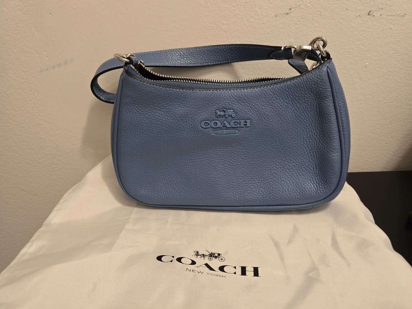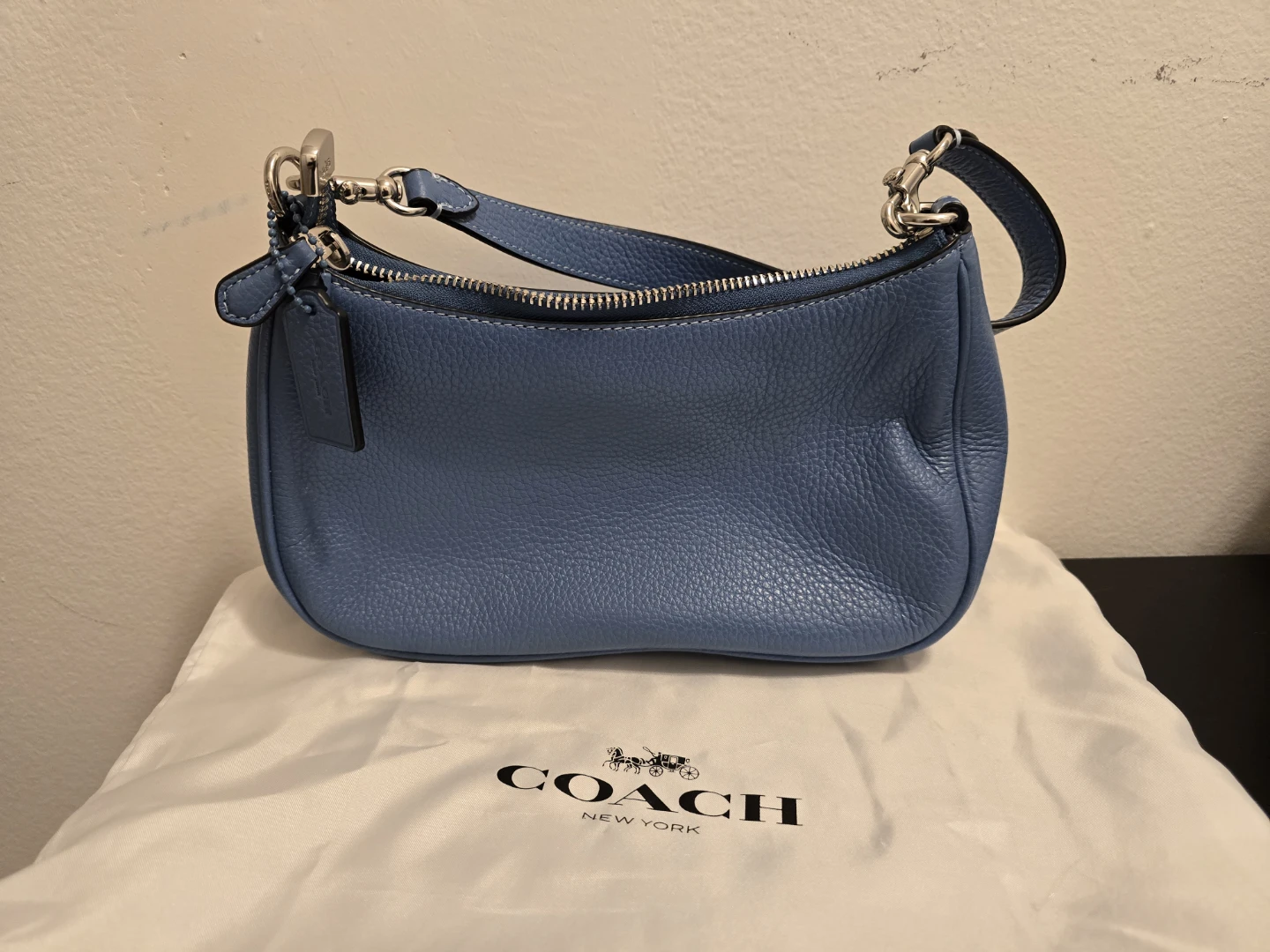 This is a blue pebble leather COACH shoulder bag. It's made from genuine leather. The bag comes with a dust bag. Unfortunately, I lost the long strap with this one as I like to wear it as a should bag. Sorry x