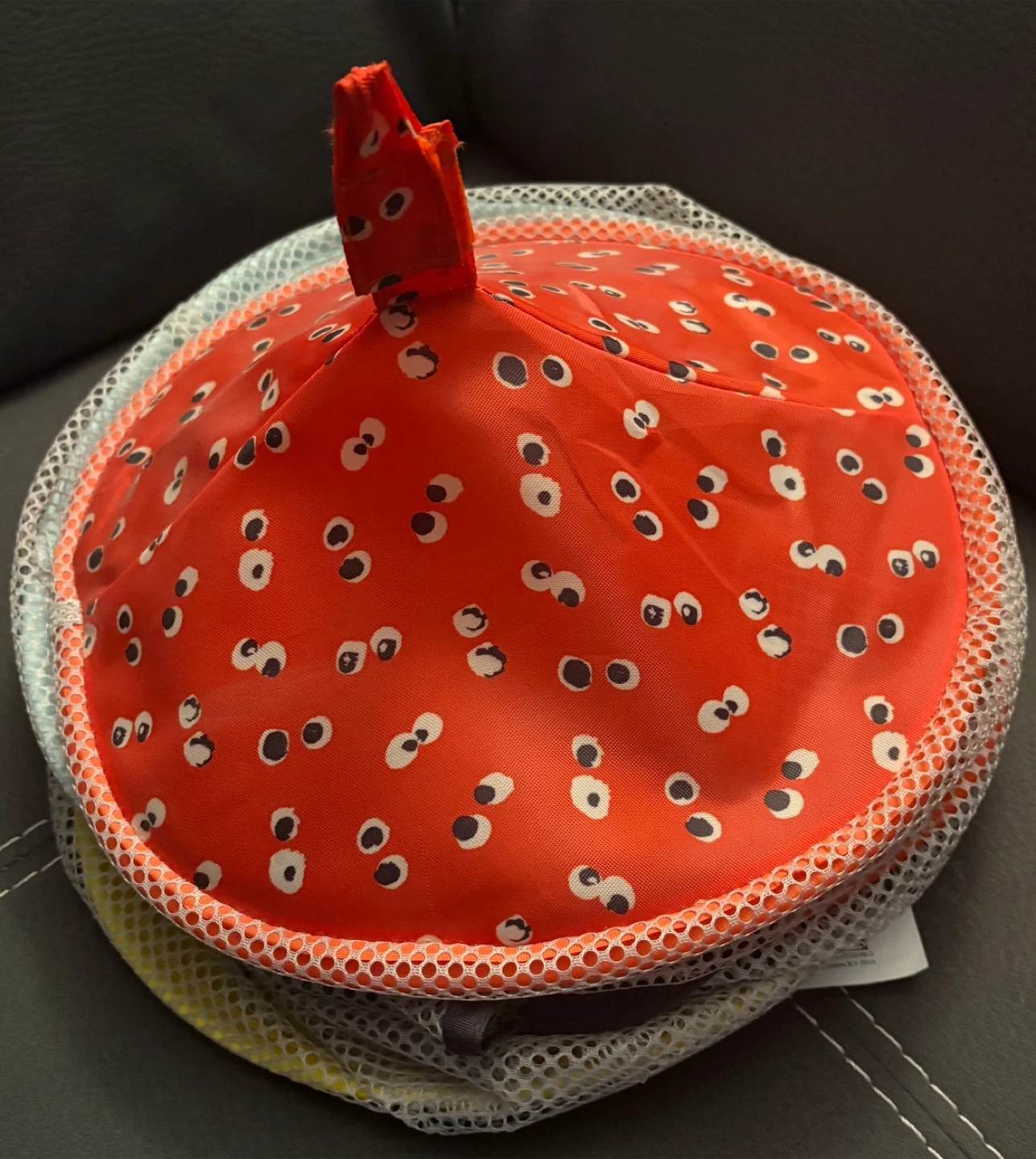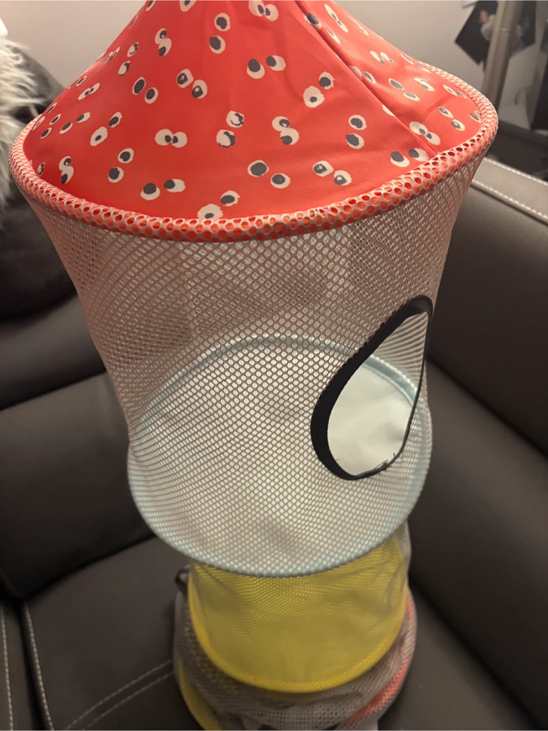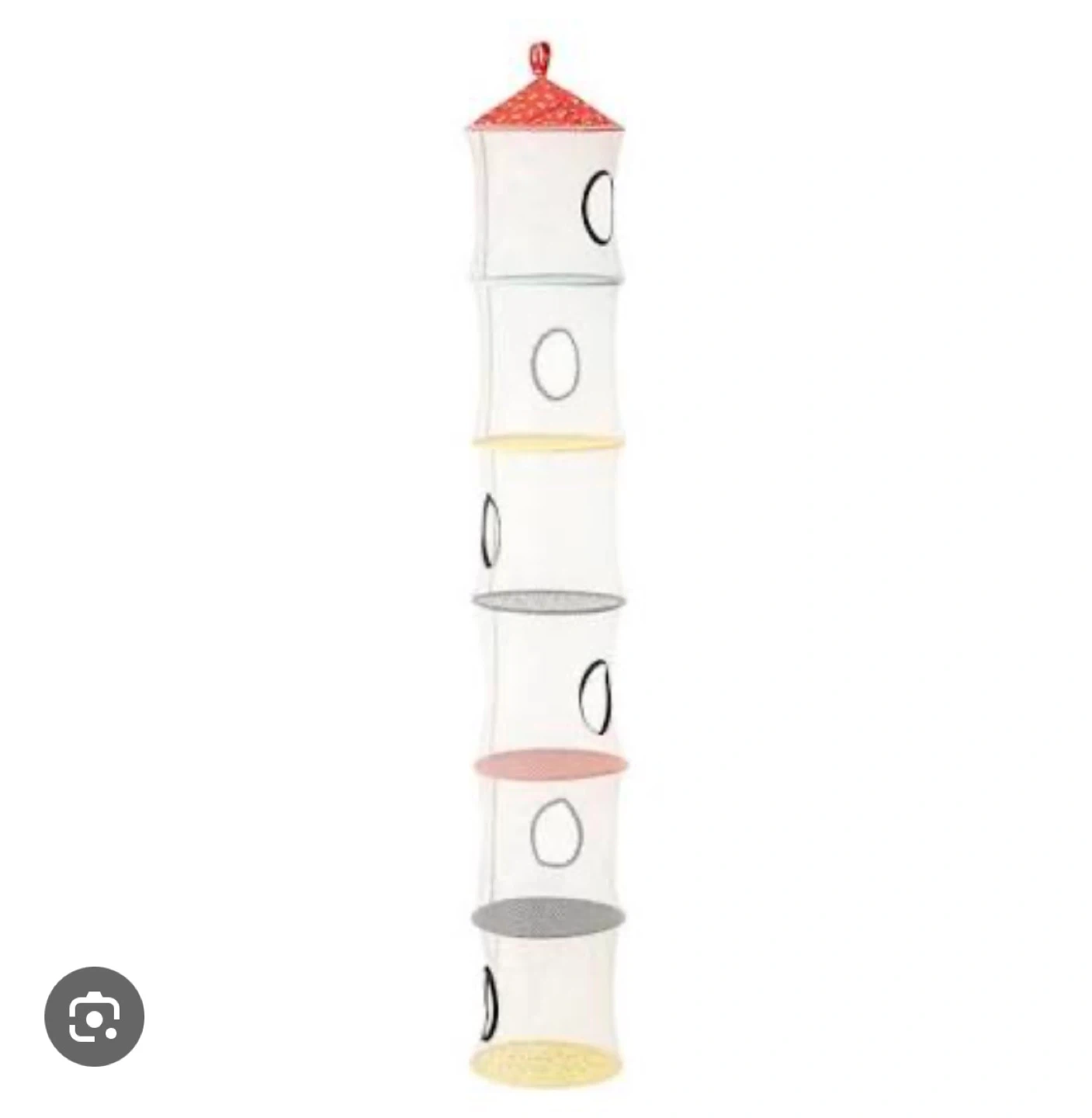 This is a discontinued IKEA Fangst mesh toy hanging organizer. It has 6 compartments and is about 12” high with about a 12” diameter per each compartment. It’s in fun colours and is in great condition.