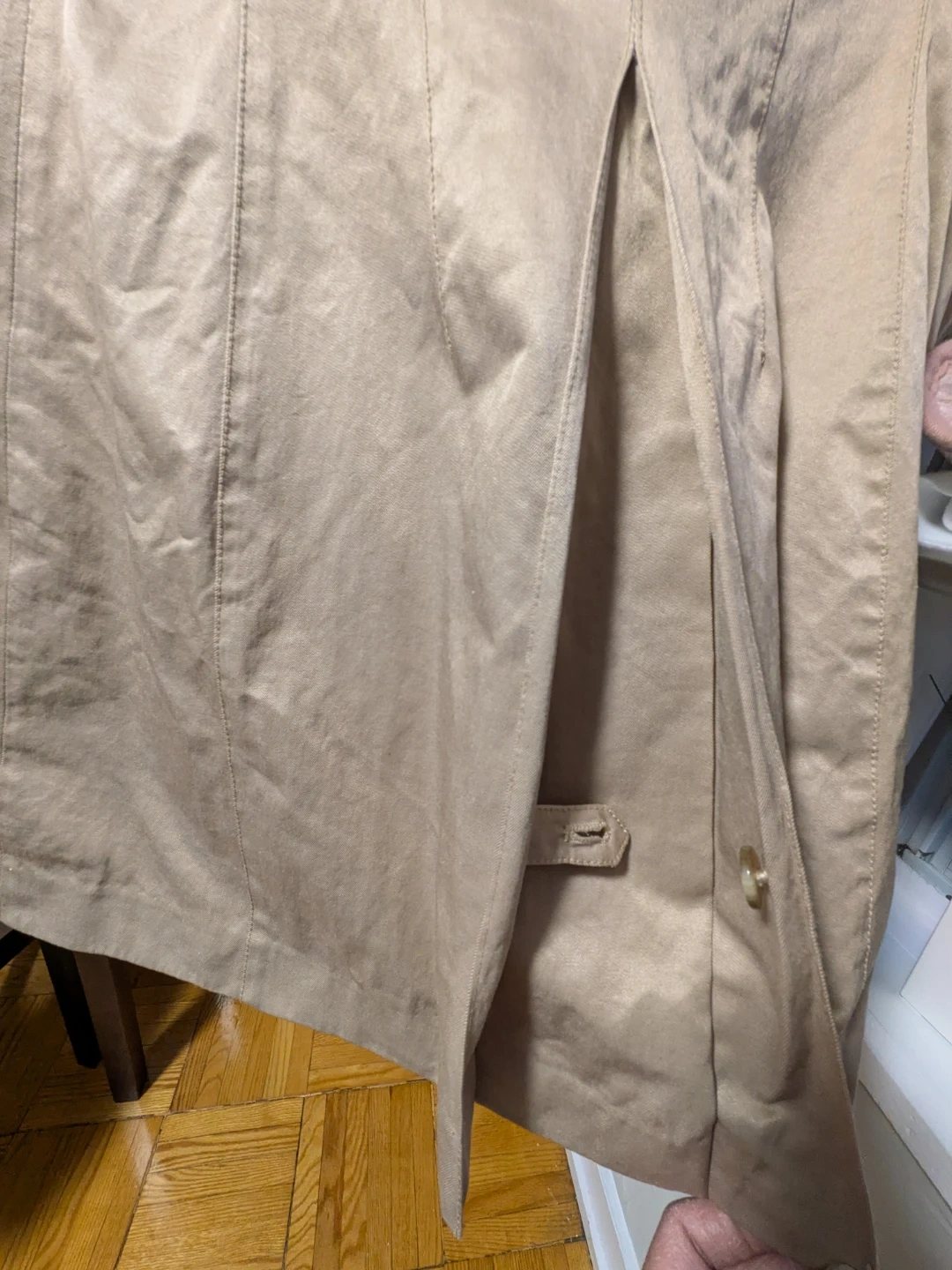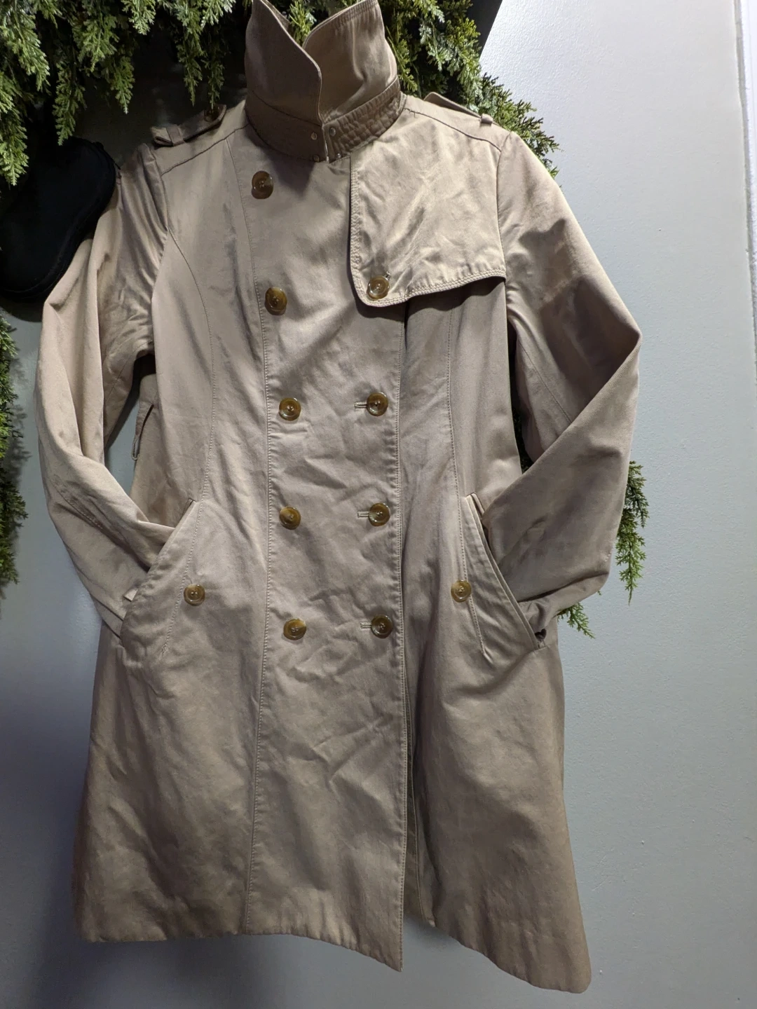 Selling a stylish beige trench coat from Soup! It features a classic double-breasted design with button closures and a flattering silhouette. Perfect for layering during those in-between seasons!