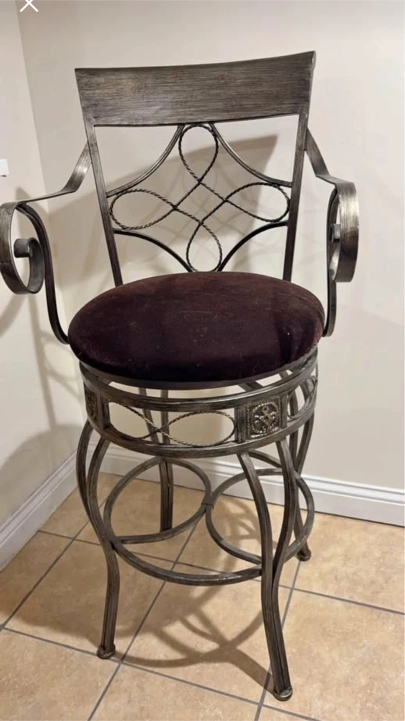 Selling a metal swivel bar stool with armrests. It features a decorative metal frame and a comfortable upholstered seat. It would make a nice addition to your kitchen or bar area!