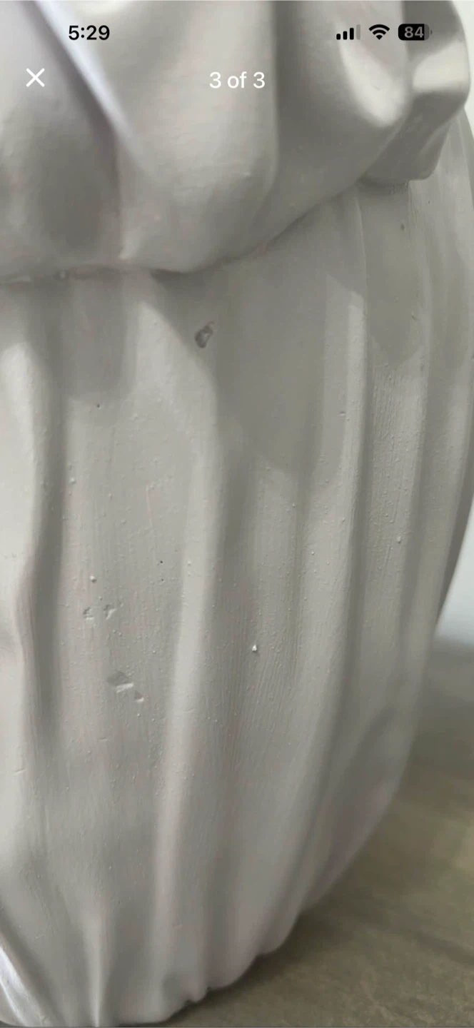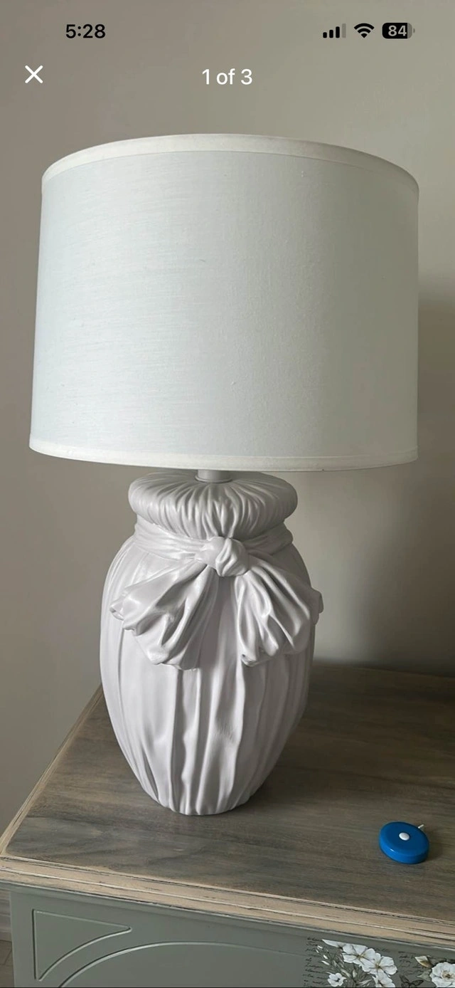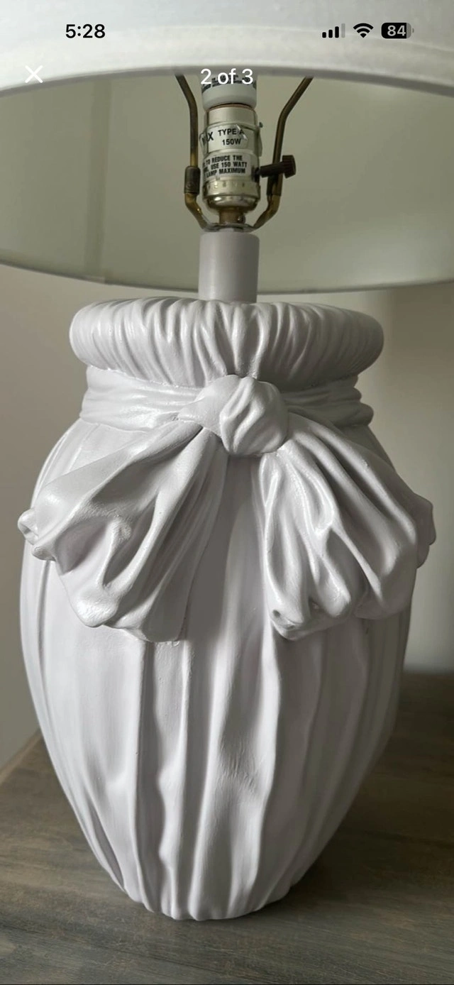This John Dickinson style plaster table lamp features a distinctive trompe l'oeil design that creates the illusion of white draped fabric tied with a bow. These lamps are highly sought-after vintage items. Mid century modern. Lamp shade included. Subtle lilac color. There are natural slight imperfections in the plaster as seen in photo. This is a heavy lamp. Dimensions: 9.5"W × 9.5"D × 20" tall. Retails for $250+. Used - Like new. For Sale By: Owner. Cash accepted. Cashless payment accepted.