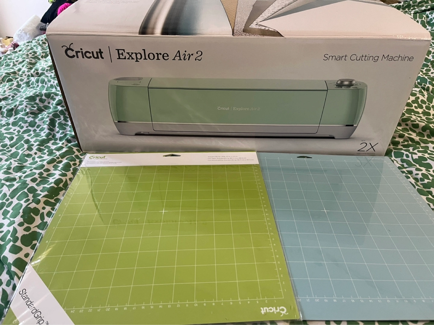Cricut Explore Air 2 in mint green. Includes machine and two cutting mats. Mint condition, barely used. Perfect for crafting and DIY projects.